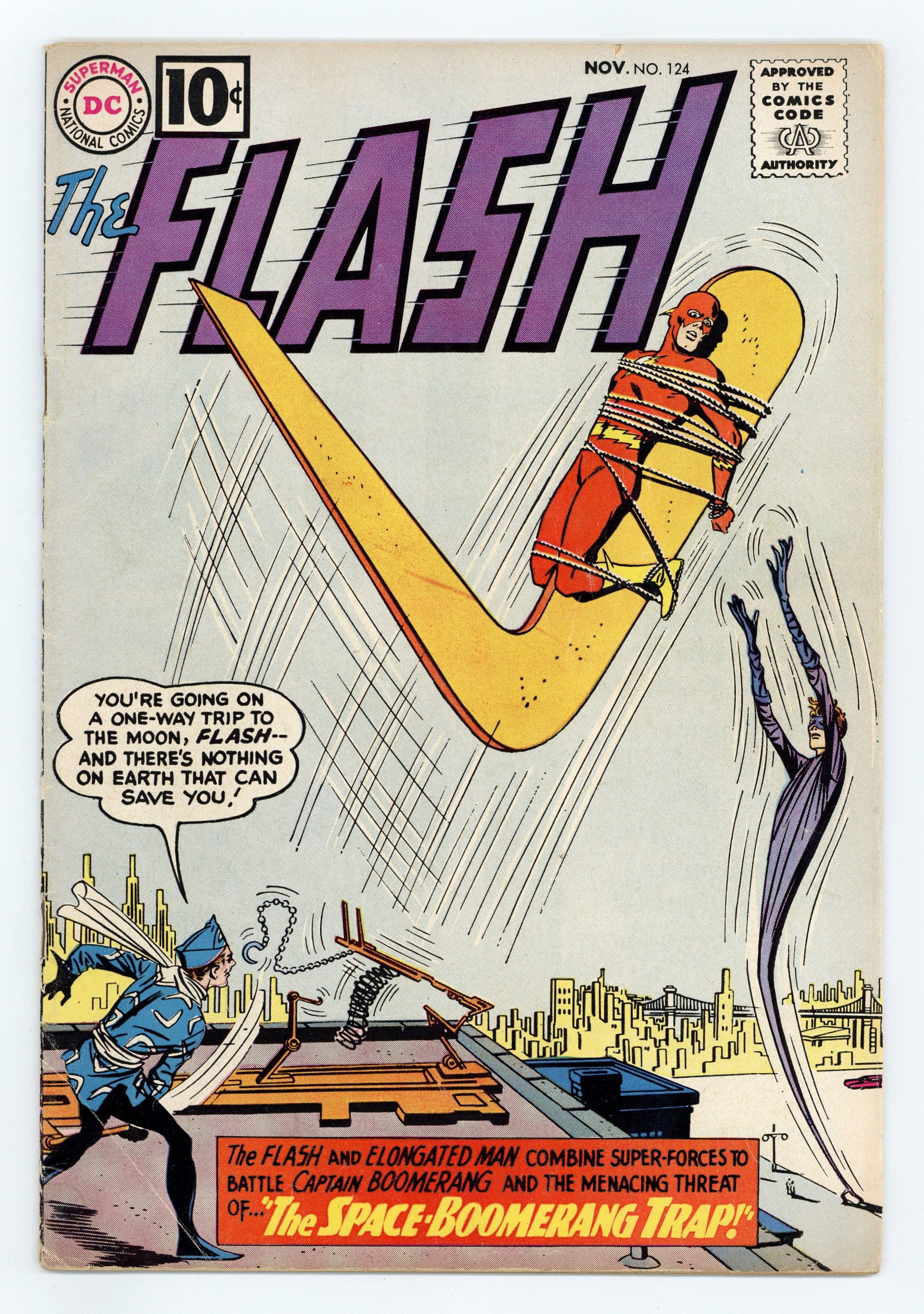 Starts Mar 9 Last 10-cent cover price. Cover pencils by Carmine Infantino, inks by Joe Giella. Space-Boomerang Trap!, script by John Broome, pencils by Carmine Infantino, inks by Joe Giella; Captain Boomerang is paroled from prison and invents a time-traveling boomerang; Flash and Elongated Man stop Boomerang; all three join together to battle aliens. Vengeance Via Television!, script by John Broome, pencils by Carmine Infantino, inks by Joe Giella; When James Lawton is released from jail he takes revenge on those who put him in jail by using his new psi-helmet. Sea Devils #1 ad. Letter from fanzine writers Bernie Bubnis and Robert Jennings. Letter from Infantino. Amazing Speeds fact page. 36 Pages, Full Color. Cover price $0.10.
