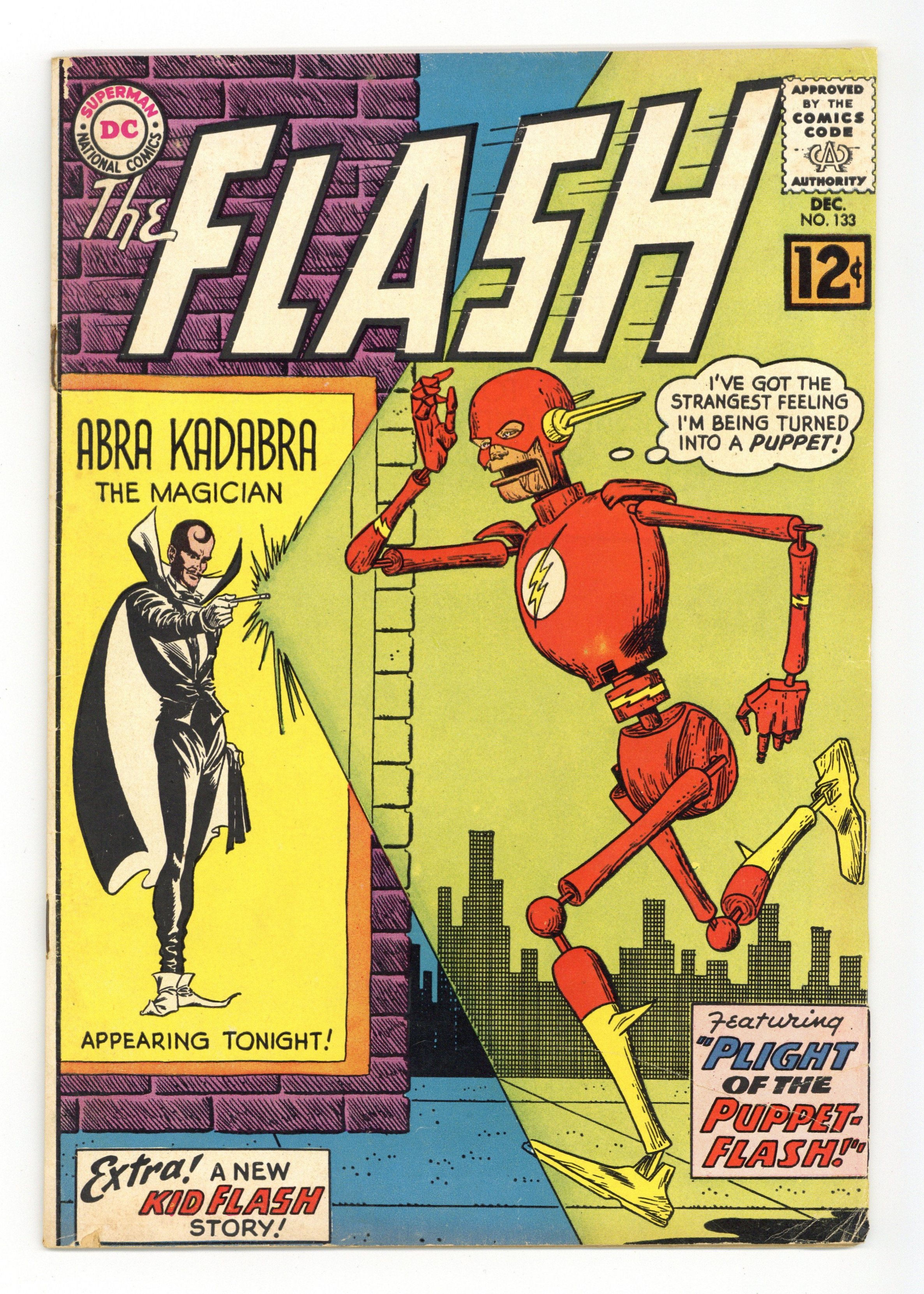 Cover pencils by Carmine Infantino, inks by Murphy Anderson. The Plight of the Puppet Flash!, script by John Broome, pencils by Carmine Infantino, inks by Joe Giella; Abra Kadabra turns Flash into a puppet. Secret of the Handicapped Boys!, script by John Broome, pencils by Carmine Infantino, inks by Joe Giella; Three handicapped boys accidentally discover that Wally West is Kid Flash. Johnny DC ad. Superman talks about Pennies for Unicef! public service ad with Superman. Ads for Giant Superman Annual and Giant Batman Annual. Brave and the Bold #45 ad with Strange Sports Stories. 36 Pages, Full Color. Cover price $0.12.