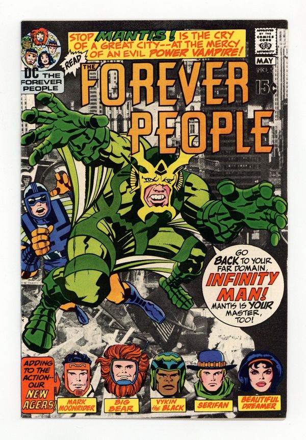 Cover pencils by Jack Kirby, inks by Vince Colletta. Super War!, script by Jack Kirby, pencils by Jack Kirby, inks by Vince Colletta; Darkseid sends Mantis to attack the Forever People. Buzzing in the Boom Tube article by Mark Evanier and Steve Sherman. 32 pgs. $0.15. Cover price $0.15.