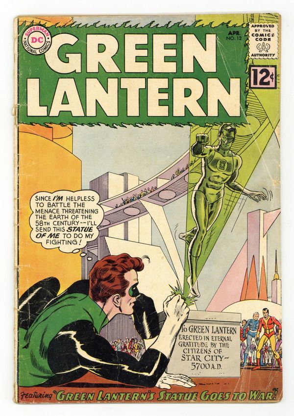 Cover pencils by Gil Kane, inks by Murphy Anderson. Green Lantern's Statue Goes to War!, script by John Broome, pencils by Gil Kane, inks by Joe Giella; Green Lantern is brought to the future again to assume his Pol Manning identity to discover why three generals are trying to overthrow the government. Zero Hour in the Silent City!, script by John Broome, pencils by Gil Kane, inks by Joe Giella; Green Lantern must discover what has stopped all sound in the city. 36 pgs. $0.12. Cover price $0.12.