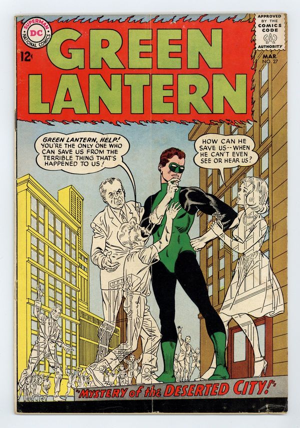 Cover pencils by Gil Kane, inks by Murphy Anderson. Mystery of the Deserted City!, script by Gardner Fox, pencils by Gil Kane, inks by Joe Giella; Green Lantern faces a villain who can phase to different planes of existence. The Amazing Transformation of Horace Tolliver, script by John Broome, pencils by Gil Kane, inks by Joe Giella; Hal accidently uses his power ring to empower a timid bank teller. 36 pgs. $0.12. Cover price $0.12.