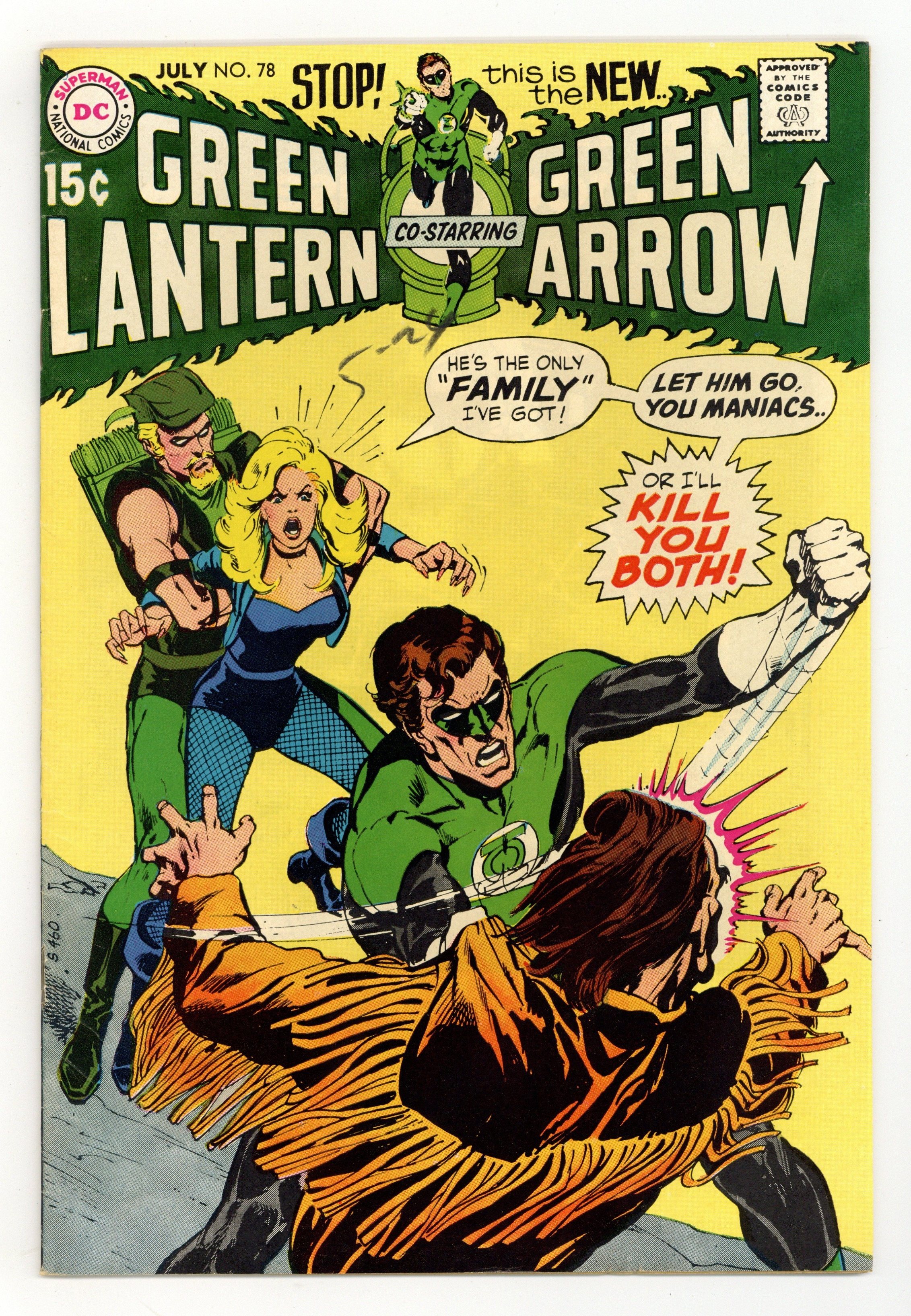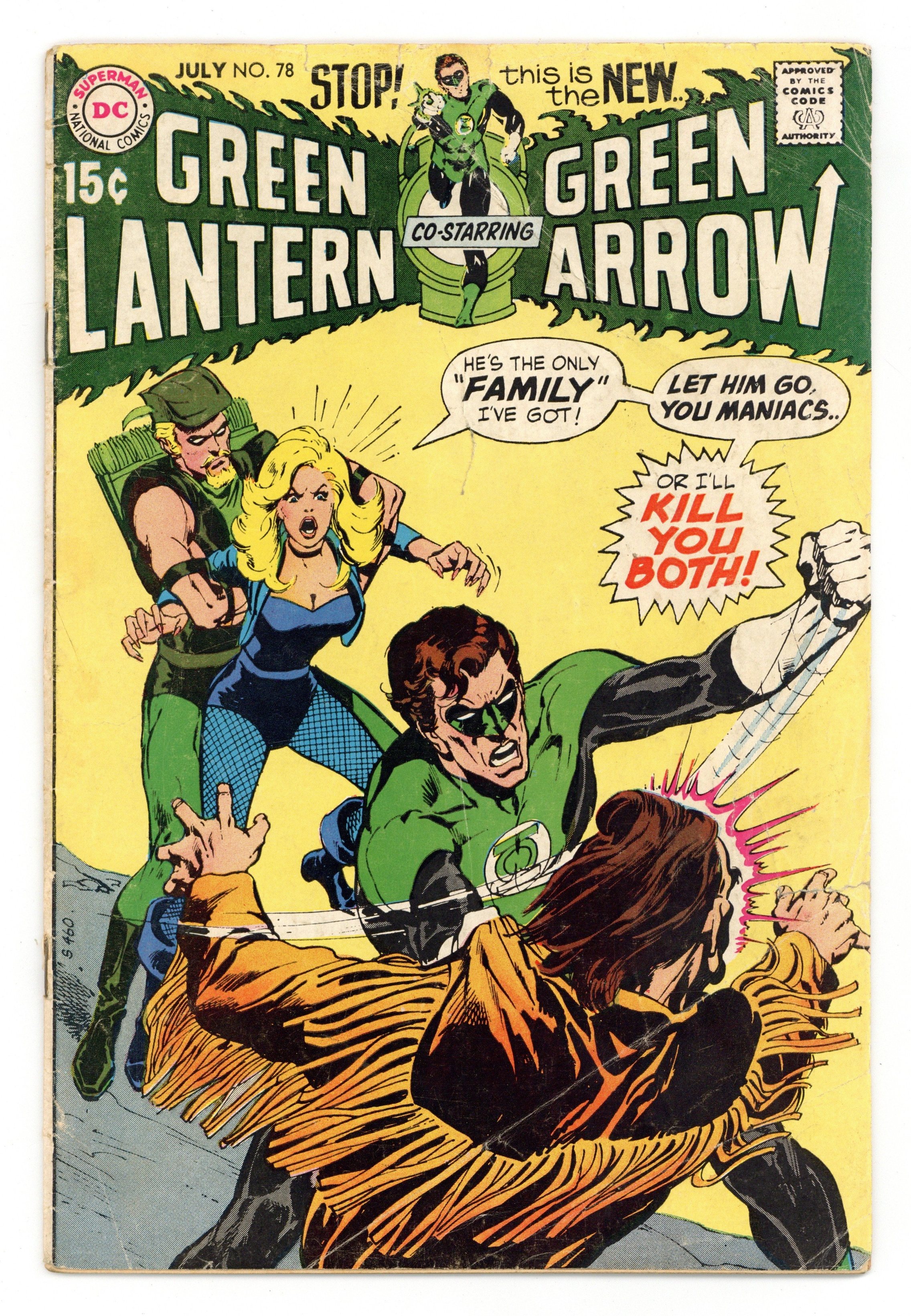 Cover art by Neal Adams. A Kind of Loving, a Way of Death!, script by Denny O'Neil, pencils by Neal Adams, inks by Frank Giacoia; After a group of thugs overpower her and steal her bike, Black Canary is found by mind-controlling cult leader Joshua; When Green Lantern and Green Arrow encounter the thugs later and recognize Canary's bike, they set off in search of their friend; Though Canary initially refuses to leave the cult, when Joshua orders her to shoot Green Arrow, her mind won't let her, and she breaks free from Joshua's control. Letters to the editor from comics writers Mike Barr and Martin Pasko. 36 pgs. $0.15. Cover price $0.15.