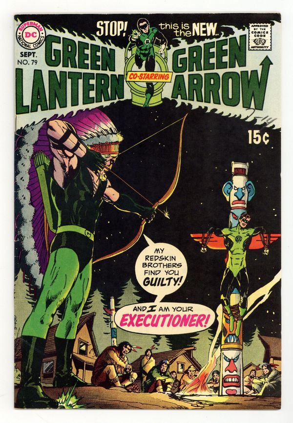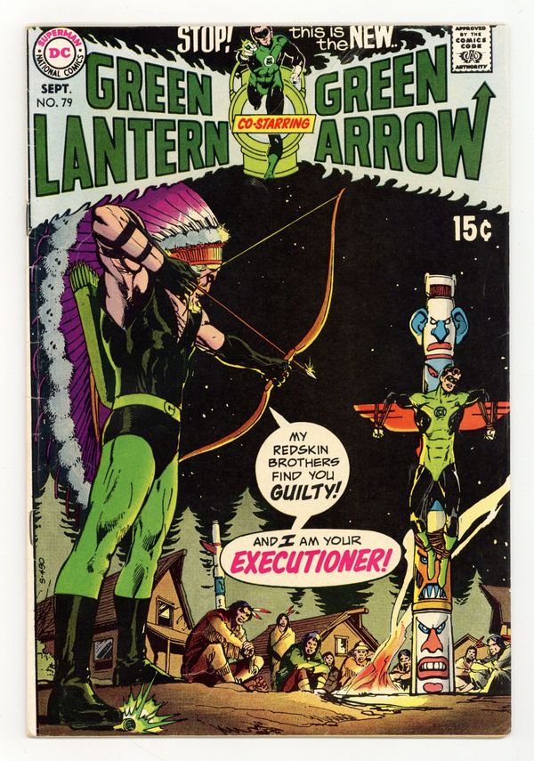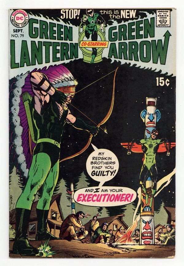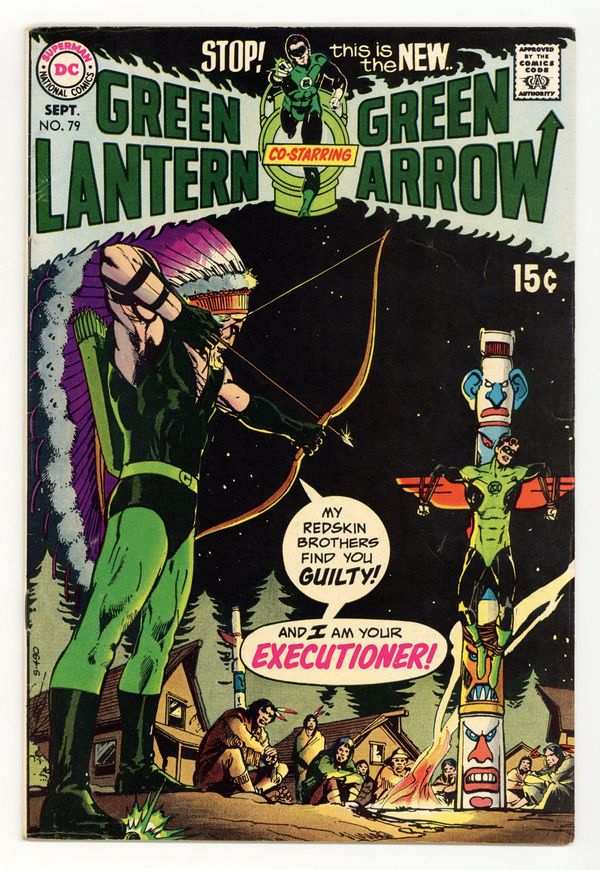 Cover art by Neal Adams. Ulysses Star Is Still Alive!, script by Denny O'Neil, pencils by Neal Adams, inks by Dan Adkins; Green Lantern and Green Arrow get involved in a dispute over logging rights on Native American land. While GL searches for documentation for the Indians' claim, GA tries to inspire them with the ghost of their ancestor; Though the heroes are able to prevent all-out conflict between the loggers and the Natives, and the leaders of the loggers are arrested, only time will tell if the Indians' claim will hold up in a court of law. Brief Black Widow appearance. 36 pgs. $0.15. Cover price $0.15.