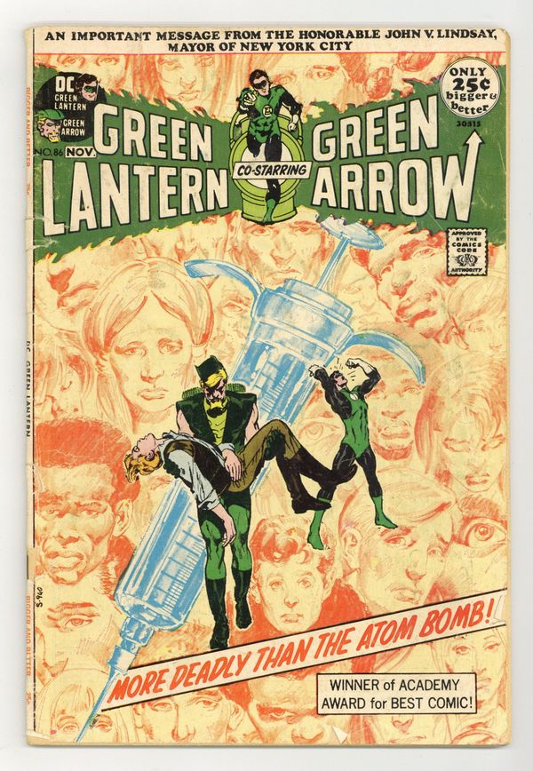 Giant-size issue. Cover by Neal Adams. Green Arrow co-stars in this famous anti-drug issue. They Say It'll Kill Me... But They Won't Say When!, script by Denny O'Neil, pencils by Neal Adams, inks by Dick Giordano; Having discovered that Roy is a junkie, Green Arrow sets out to bring the drug traffickers down; Green Lantern returns to Oliver's building and finds Roy curled up in the basement; He takes Roy to Dinah's to straighten out and heads out to find Green Arrow, who has been knocked out by the drug dealers and tossed into the harbor to drown; GA escapes just as GL arrives to take out the goons who threw him into the water; Together the two trace the drugs to pharmaceutical magnate Salomon Hooper and put him out of business; But Roy explains that drugs are not the root problem, just a symptom of it. Anti-drug message from John V. Lindsay, mayor of New York City (1966-1973), thanking DC Comics for publishing the Green Lantern story in this and the previous issue. Reprint story: The Icicle Goes South! (from All-American Comics 92, December 1947), script by Robert Kanigher, art by Alex Toth; Green Lantern must stop the Icicle, who is helping a dictator to take over the South American country of Perumbia. 52 pgs., full color. $0.25. Cover price $0.25.