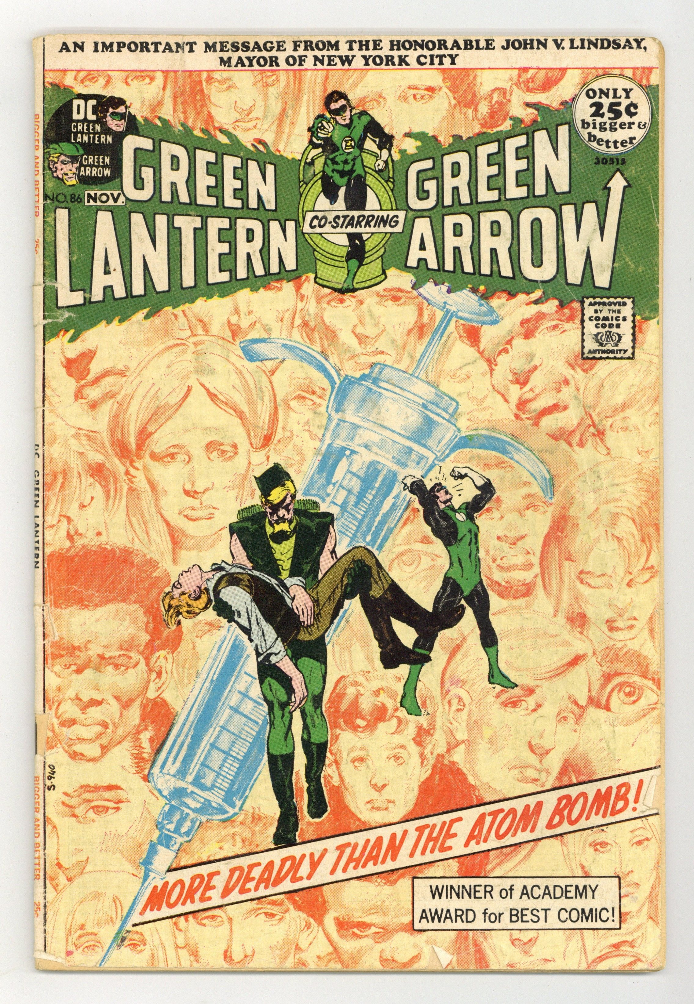 Starts Mar 2 Giant-size issue. Cover by Neal Adams. Green Arrow co-stars in this famous anti-drug issue. They Say It'll Kill Me... But They Won't Say When!, script by Denny O'Neil, pencils by Neal Adams, inks by Dick Giordano; Having discovered that Roy is a junkie, Green Arrow sets out to bring the drug traffickers down; Green Lantern returns to Oliver's building and finds Roy curled up in the basement; He takes Roy to Dinah's to straighten out and heads out to find Green Arrow, who has been knocked out by the drug dealers and tossed into the harbor to drown; GA escapes just as GL arrives to take out the goons who threw him into the water; Together the two trace the drugs to pharmaceutical magnate Salomon Hooper and put him out of business; But Roy explains that drugs are not the root problem, just a symptom of it. Anti-drug message from John V. Lindsay, mayor of New York City (1966-1973), thanking DC Comics for publishing the Green Lantern story in this and the previous issue. Reprint story: The Icicle Goes South! (from All-American Comics 92, December 1947), script by Robert Kanigher, art by Alex Toth; Green Lantern must stop the Icicle, who is helping a dictator to take over the South American country of Perumbia. 52 pgs., full color. $0.25. Cover price $0.25.