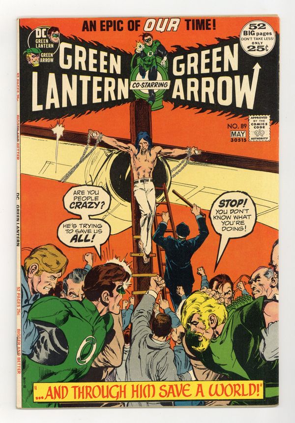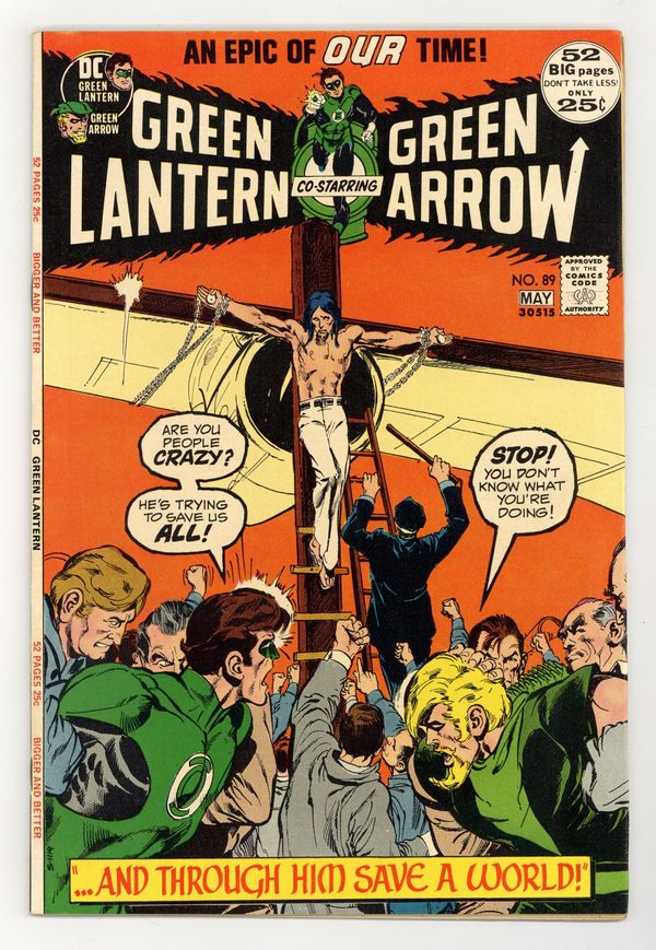 Giant-size issue. Cover by Neal Adams. ...And through Him Save a World..., script by Denny O'Neil, pencils by Neal Adams, inks by Neal Adams; Green Arrow goes with Green Lantern and Carol Ferris to the Ferris Aircraft plant in Abraham, which has been the target of ecological prankster Isaac; When Isaac accidentally threatens Carol, GL tries to take him into custody, but GA gases him. Reprint back-up story: the Golden Age Green Lantern stars in The Impossible Mr. Paradox! (from the original Green Lantern 38, May 1949), script by John Broome, art by Irwin Hasen; The cancellation of Clay Chalmers' program at Station WXYZ leads Alan Scott to believe Chalmers is the new criminal haunting Gotham City, Mr. Paradox, who attempts to defeat Green Lantern by employing illusions based on scientific paradoxes. Tarzan ad. 52 pgs., full color. $0.25. Cover price $0.25.
