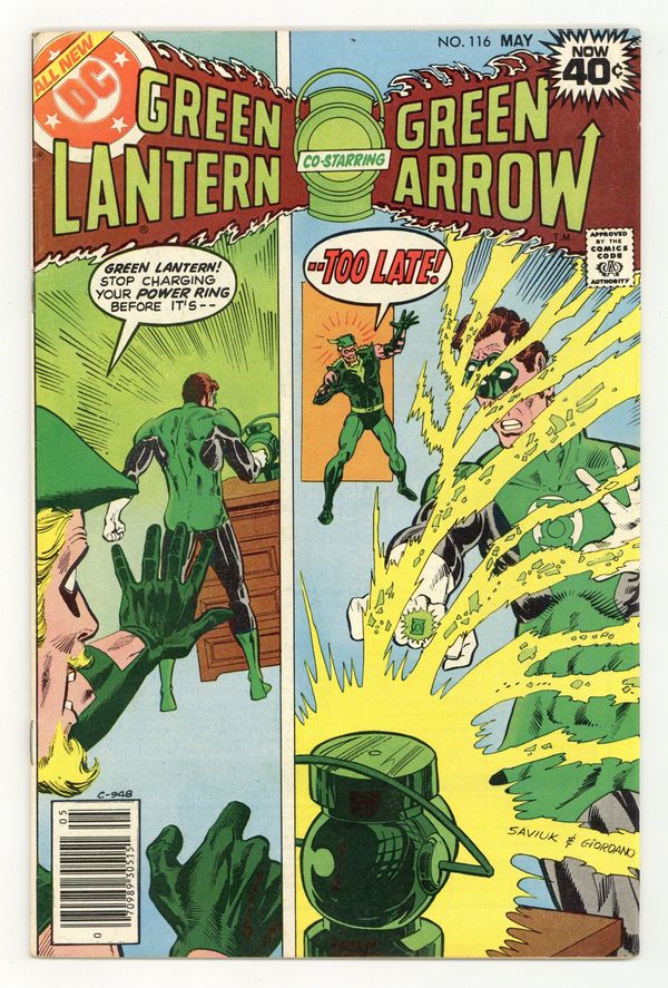 1st app. Guy Gardner as Green Lantern (#59 was imaginary story). "My Ring, My Enemy." Green Arrow teams with Guy Gardner against Professor Ojo. Meanwhile, Green Lantern goes to Oa to check his defective ring. Script by Denny O'Neil, pencils by Alex Saviuk, inks by Dave Hunt. Cover by Alex Saviuk and Dick Giordano. Cover price $0.40.