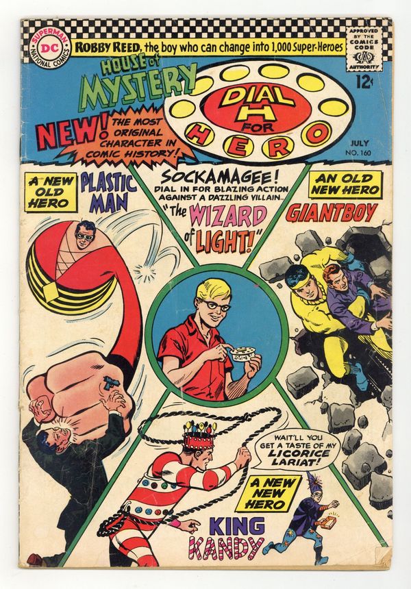 Cover art by Jim Mooney. Batman ad. 1st Silver Age appearance of Plastic Man in the Dial H for Hero story "The Wizard of Light," script by Dave Wood, art by Jim Mooney; While staying with his cousin Ned, Robby Reed uses his H-Dial to battle the villainous Wizard of Light in various super-heroic guises, including that of Plastic Man! "Natural Beauty -- Everybody's Fight" public service announcement, script by Jack Schiff; excerpts from a speech by President Lyndon Johnson regarding the preservation of nature. Teen Titans ad. Letter to the editor from Irene Vartanoff. Statement of ownership--average print run 331,000; average print run 196,677. "Manhunter's New Secret Identity" starring J'onn J'onzz Manhunter from Mars, script by Jack Miller, art by Joe Certa; Manhunter agrees to infiltrate the criminal organization called VULTURE; He assumes the identity of Marce Xavier, a European playboy who recently died in an accident but whose death was not reported. Batman and Robin ad. 36 Pages, Full Color. Cover price $0.12.