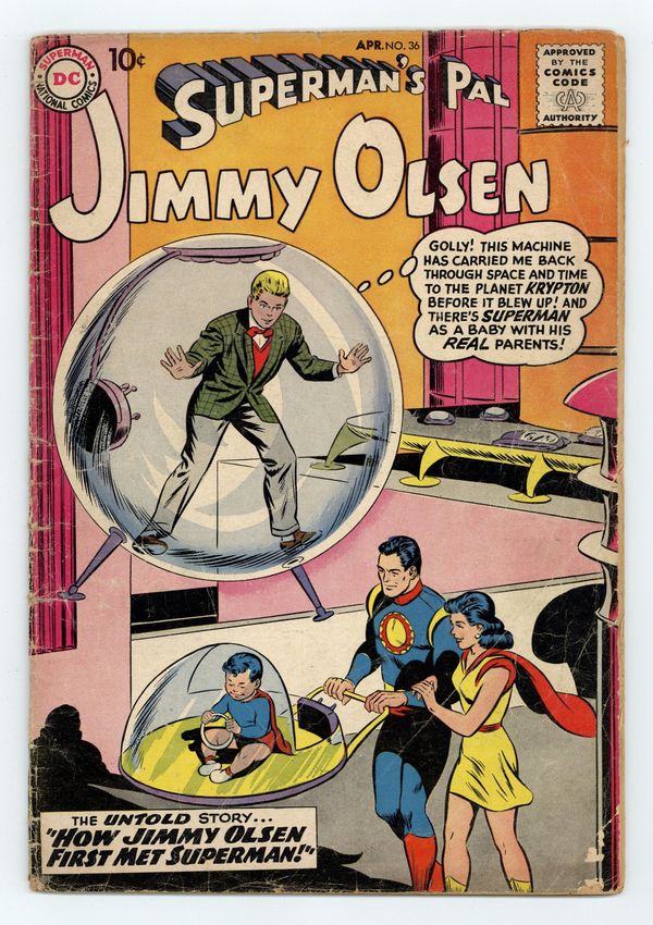 Cover pencils by Curt Swan, inks by Stan Kaye. Super-Senor's Pal!, script by Otto Binder, pencils by Curt Swan, inks by Ray Burnley; Perry sends Jimmy to the South American country of Peccador, to investigate rumors of a "flying man" that sounds suspiciously like Superman. What's Your B. Q.*? (*Brotherhood Quotient) public service announcement, script by Jack Schiff, art by Bernard Baily. The Brave and the Bold #23 ad. Lois Lane's Sister!, script by Otto Binder, pencils by Curt Swan; Jimmy falls hard for Lois Lane's sister, spending a lot of energy making sure that Lucy keeps a second date with him, including unlocking his disguise trunk and taking on the identity of "Tex" Bolton. Shorty humor page by Henry Boltinoff. How Jimmy Olsen First Met Superman!, script by Otto Binder, pencils by Curt Swan, inks by Ray Burnley. 36 Pages, Full Color. Cover price $0.10.