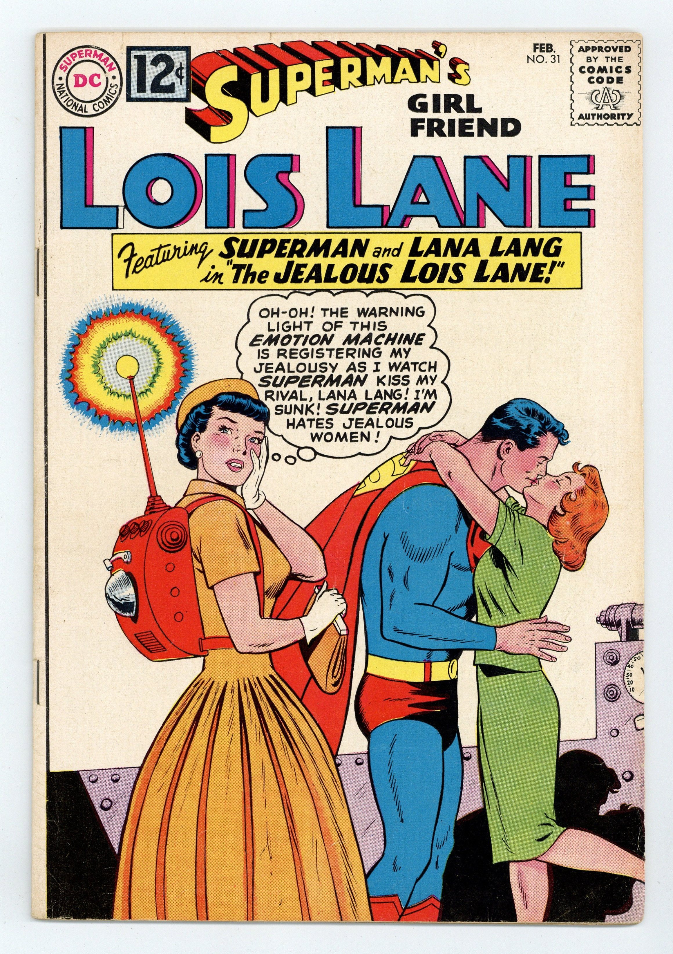 Tags: Print Run Statistics, Superman$21.00Cover pencils by Curt Swan, inks by George Klein. The Magic Spectacles!, art by John Forte; Lois acquires a pair of magoc glasses that show her what animal each person she encounters most resembles in personality; Superman must somehow stop her before she looks at Clark Kent. House ad for Superman Annual #4. The Jealous Lois Lane!, art by Kurt Schaffenberger; Lois is wearing Professor Potter's new invention, a machine that rings when the user is jealous, but she goes to great lengths to keep the bell from ringing so that no one will know that she minds when Superman is nice to other women. The Unforgettable Superman!, art by Kurt Schaffenberger; Lois and Lana both meet handsome military men and consider getting married, but neither one can give up on the idea of someday marrying Superman. 36 Pages, Full Color. Cover price $0.12.