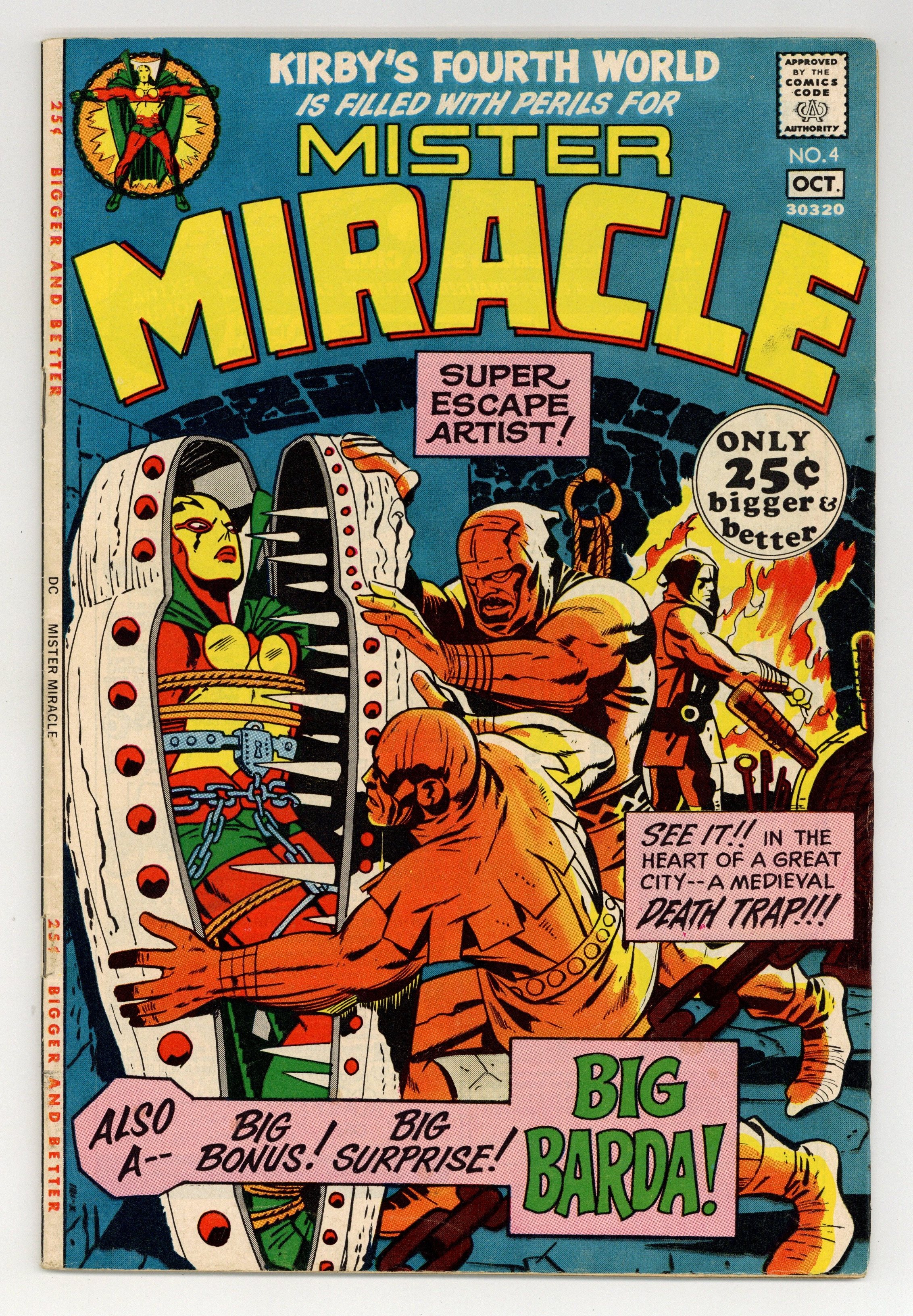 "The Closing Jaws of Death." Yet another action packed, whiz bang adventure, this issue finds Mister Miracle trying to escape from a trap by Dr. Bedlam. Features the first appearance of Big Barda. Back-up Boy Commandos reprints begin in this issue. Script, pencils, and cover by Jack Kirby. Inks by Vince Colletta. Cover price $0.25.