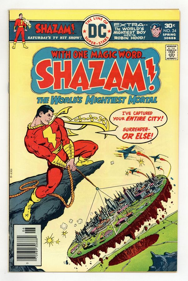 Cover art by Ernie Chan and Bob Oksner. Sivana Saves Captain Marvel, script by Otto Binder, art by C. C. Beck; Dr. Sivana traps Billy with paralyzing gas and leaves him in outer space, unable to change to Captain Marvel; But when he discovers the Azpaks have taken over the world and want to kill him, Sivana is forced to rescue Billy to help destroy the Azpaks; reprinted from Captain Marvel Adventures #148 (1953). In the Days of Robin Hood, script by William Woolfolk, art by Bud Thompson; Freddy is magically summoned into the past by his ancestor to help him rescue Robin Hood and his Merry Men from the Earl of Nottingham; reprinted from Captain Marvel Jr. #118 (1953). Hostess Twinkies ad featuring Superman, art by Curt Swan and Vince Colletta. Statement of ownership--average print run 349,000; average paid circulation 123,000. 36 pgs., full color. $0.30. Cover price $0.30.