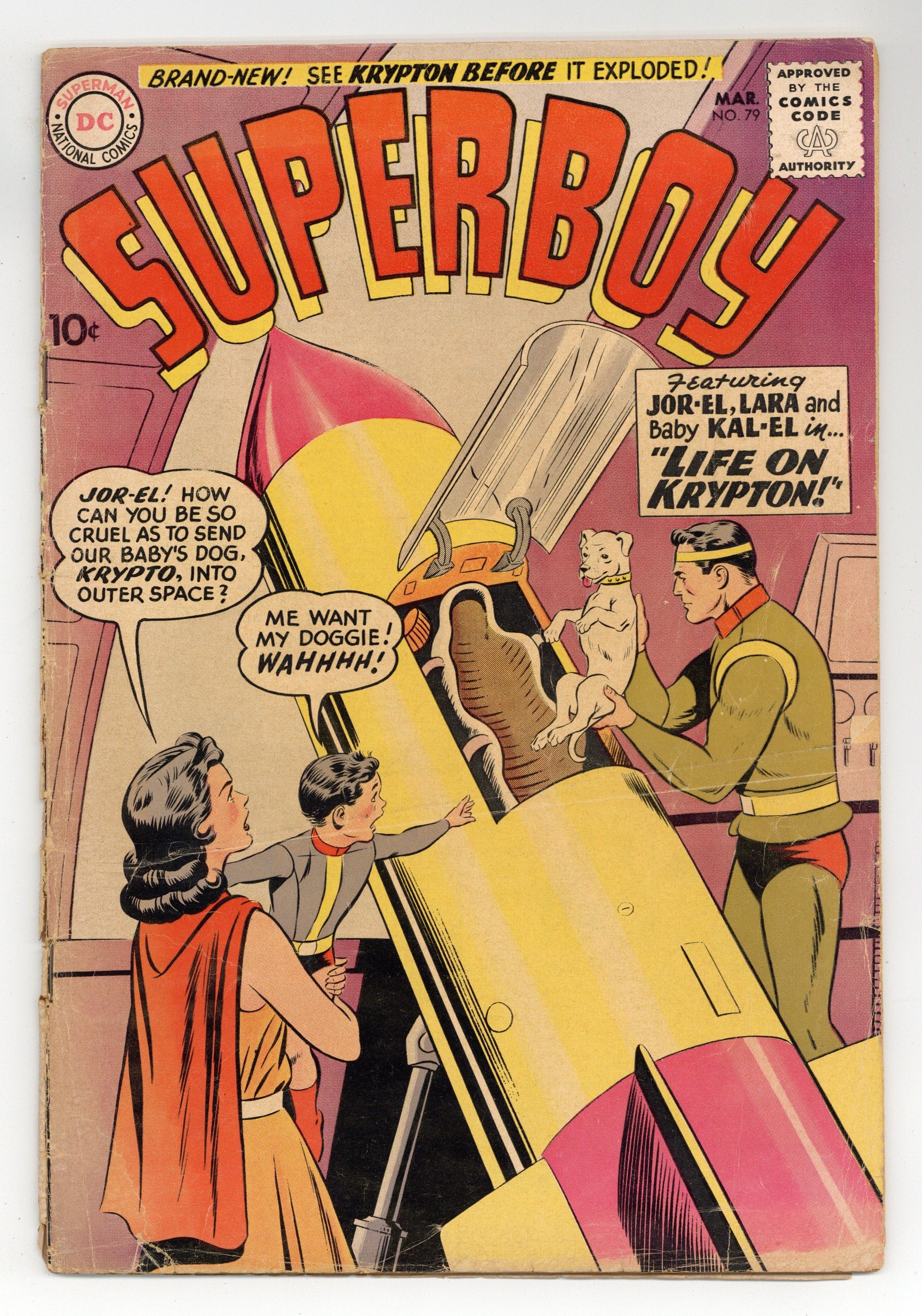 Cover pencils by Curt Swan, inks by Stan Kaye. The Spoiled Superboy!, art by Al Plastino; After Smallville refuses to make Superboy a special deputy, he goes on a rampage of poor sportsmanship. Varsity Vic humor page by Henry Boltinoff. The Notorious Captain Sinbad Kent!, script by Robert Bernstein, art by John Sikela; Superboy makes a time trip to prove the Kents aren't descended from pirates. Jerry Jitterbug humor page by Henry Boltinoff. Life on Krypton!, script by Jerry Siegel, art by George Papp; Using his Mind Prober Ray, Superboy recalls the events of a day of his life as young Kal-El on Krypton; His father Jor-El had put Krypto into a test rocket and sent him into space, but was unable to bring him back. 36 Pages, Full Color. Cover price $0.10.