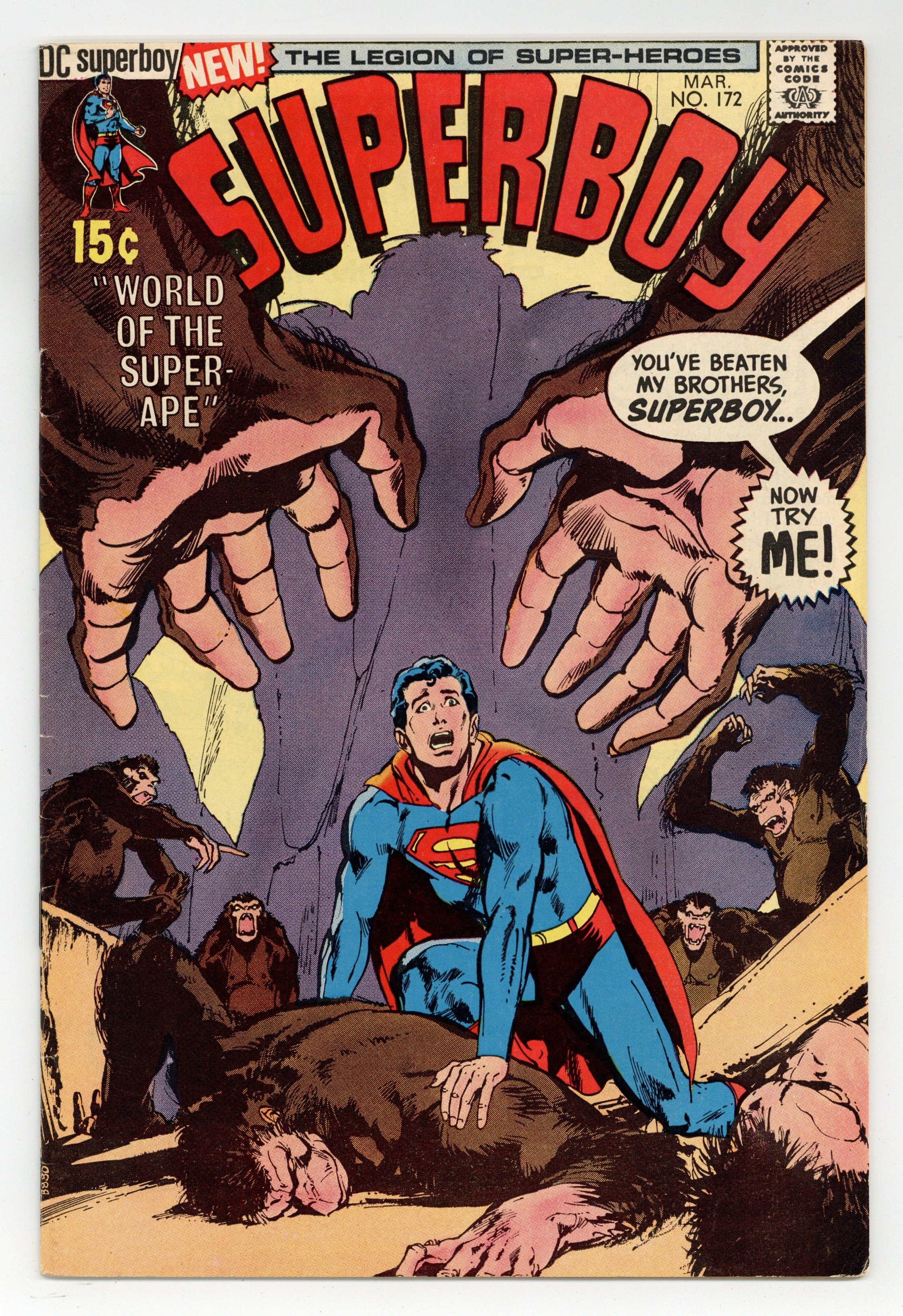 Cover art by Neal Adams. The World of the Super-Ape!, script by Frank Robbins, pencils by Bob Brown, inks by Murphy Anderson; Superboy meets Yango, a gorilla from Krypton, who speaks Kryptonian and possesses the same powers as Superboy. Brotherly Hate!, script by E. Nelson Bridwell, art by George Tuska; Lightning Lad, Light Lass, and Timber Wolf track down Lightning Lord, who has robbed the Inter-Planetary Bank. Statement of ownership--average print run, approximately 752,599; average paid circulation 377,525. 36 Pages, Full Color. Cover price $0.15.