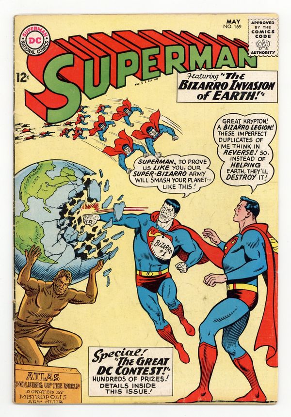 Cover pencils by Curt Swan, inks by George Klein. The Infernal Imp! starring Superman and Mr. Mxyzptlk, script by Jerry Siegel, pencils by Curt Swan, inks by George Klein. The Man Who Stole Superman's Secret Life!, script by Jerry Siegel, art by Al Plastino; a sequel to The Sweetheart Superman Forgot! from Superman #165. The Bizarro Invasion of Earth!, script by Jerry Siegel, art by Al Plastino; The Bizarro Supermen come to Earth and perform "good deeds." Letters page contains a Kryptonite Guide List noting the different kinds of Kryptonite and their effects on Superman. 36 Pages, Full Color. Cover price $0.12.