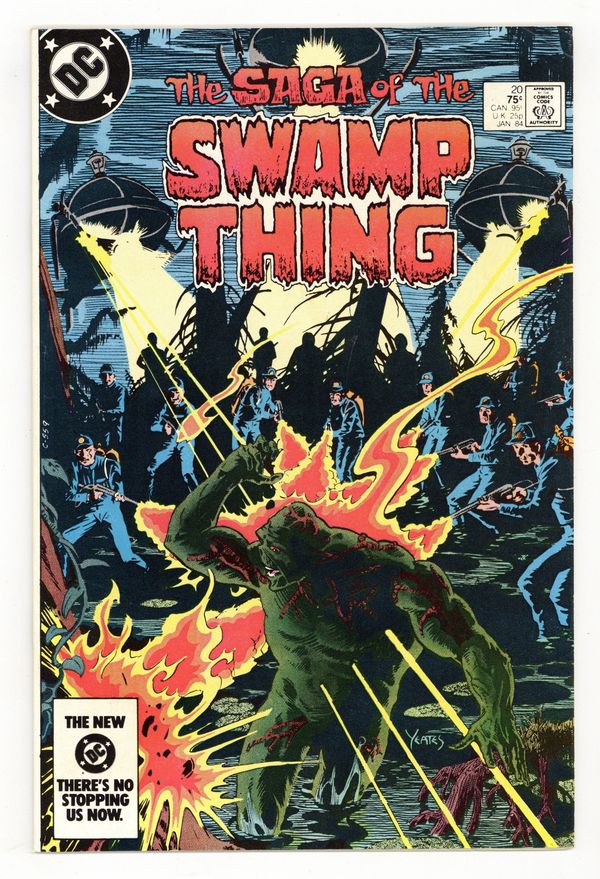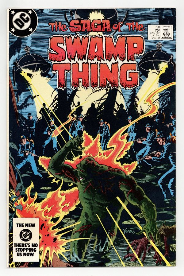 Direct Edition. 1st Alan Moore script on this title. Cover art by Tom Yeates. Loose Ends, script by Alan Moore, art by Dan Day and John Totleben; After beating Arcane, Swamp Thing is trying to find his body; General Sunderland's men follow Liz Tremayne and Dennis Barclay to find Swamp Thing; they are supposed to hunt and kill Swamp Thing; Sunderland's men kill The Swamp Thing, but fail to kill Liz and Dennis. 36 pgs., full color. $0.75. Cover price $0.75.