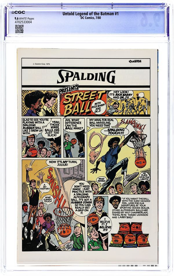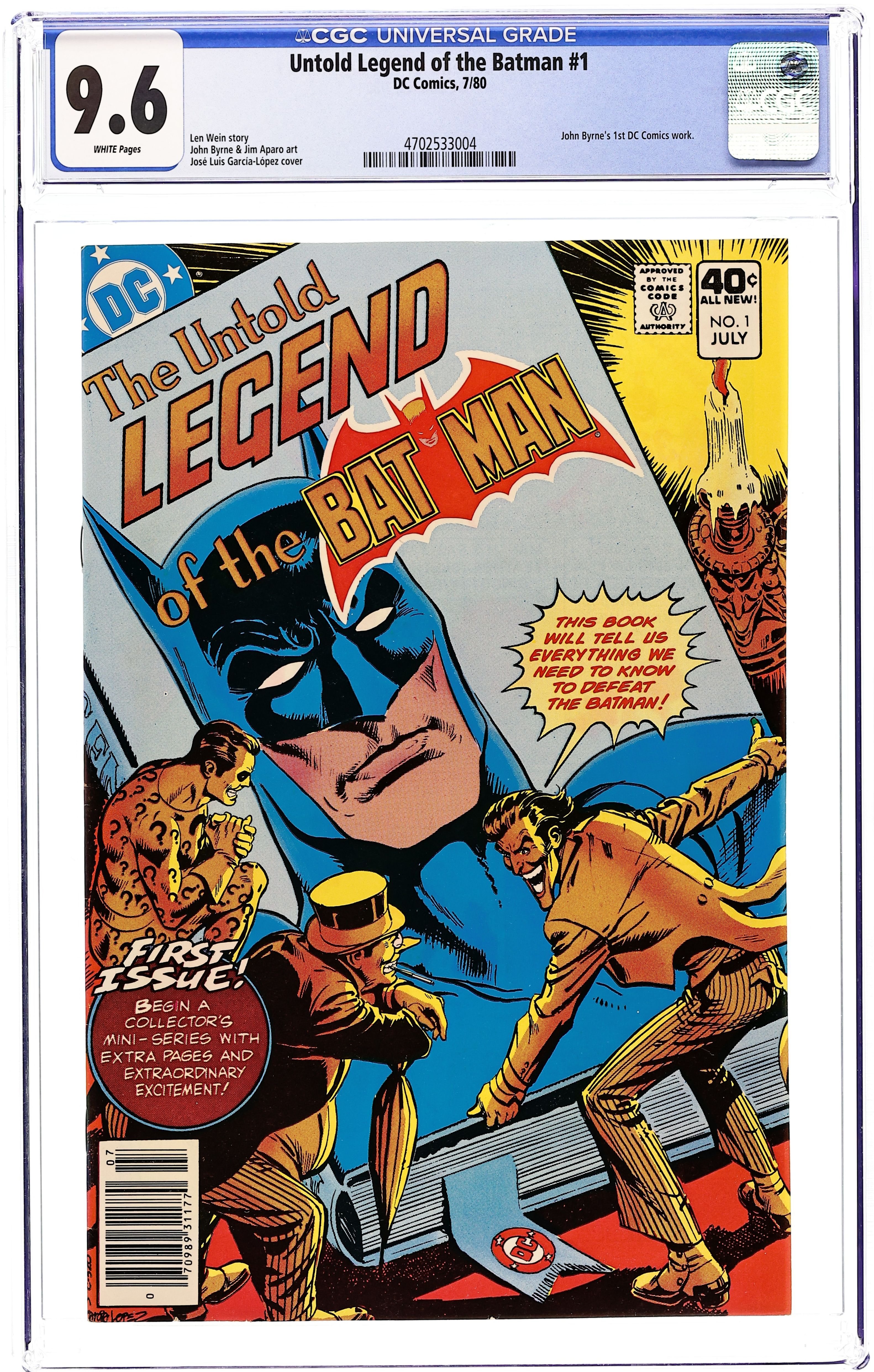 "In the Beginning..." Published after Krypton Chronicles (which gave Superman's back story), Untold Legend of Batman fills in missing bits and pieces of the Caped Crusader's crime fighting career. This first issue recaps Batman's origin and finds the character puzzling over a package containing remnants of a bat costume worn by Thomas Wayne. Script by Len Wein, pencils by John Byrne, inks by Jim Aparo, cover by José Luis Garcia-Lopez. COMIC ONLY (this is not the MPI Audio Edition, released with cassette tape.) Cover price $0.40.
