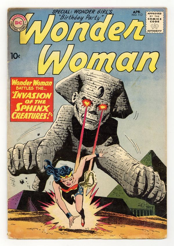 Cover pencils by Ross Andru, inks by Mike Esposito. "The Invasion of the Sphinx Creatures Part 1," script by Robert Kanigher, pencils by Ross Andru, inks by Mike Esposito; Wonder Woman discovers she has a resemblance to Queen Mikra who ruled long ago. "Wonder Girls Birthday Party!", script by Robert Kanigher, pencils by Ross Andru, inks by Mike Esposito; Wonder Girl reminiscences about past birthdays and then a giant Roc steals her birthday cake. "Invasion of the Sphinx Creatures Part 2," script by Robert Kanigher, pencils by Ross Andru, inks by Mike Esposito; Queen Mikra, a mummy, returns to life and leads the Sphinx on an invasion. Newspaper Campaigns of Good Will filler page. 36 pages, Full Color. Cover price $0.10.