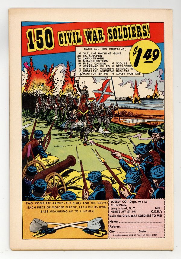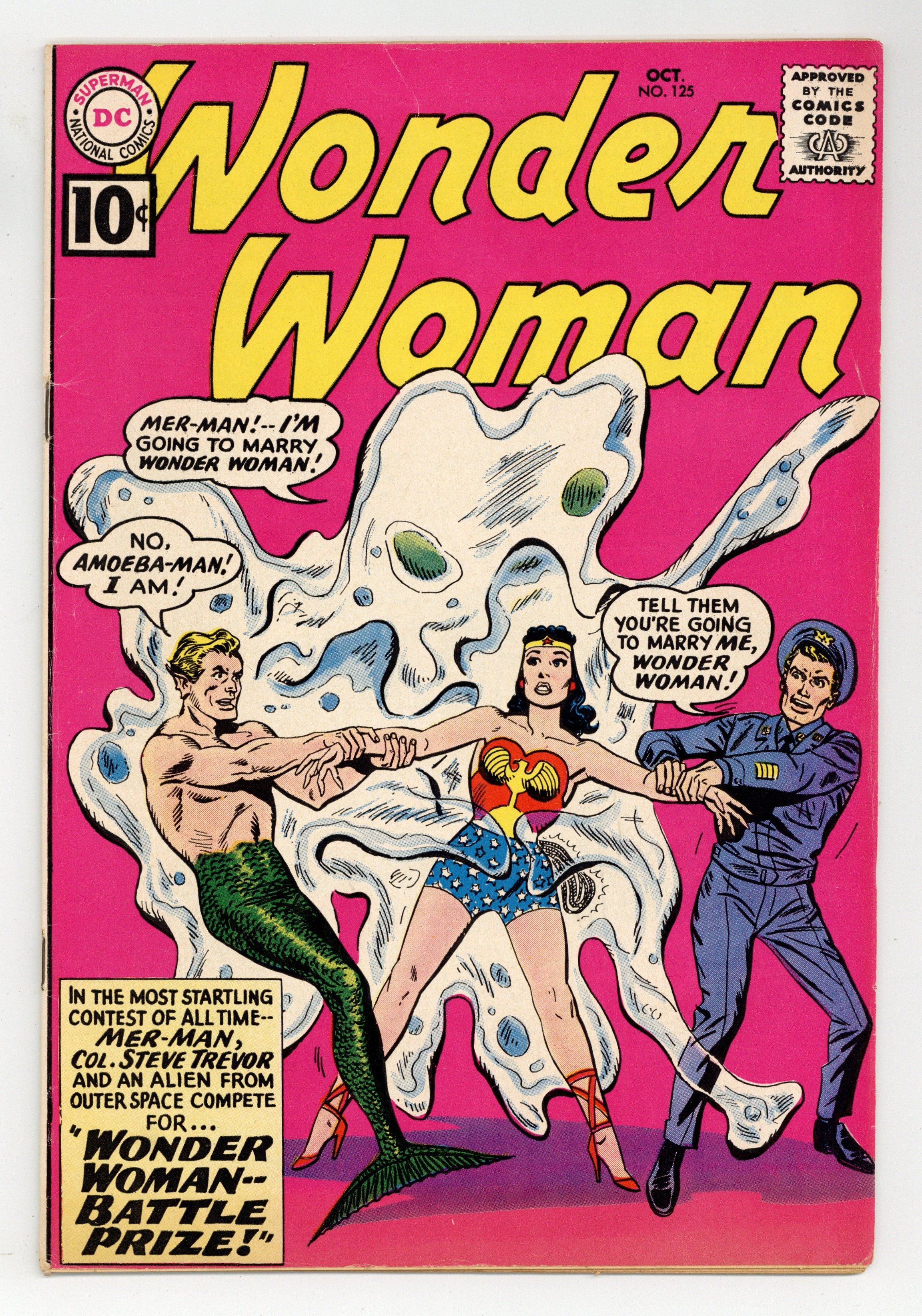 First 12-cent cover price. Cover pencils by Ross Andru, inks by Mike Esposito. "Wonder Woman - Battle Prize," script by Robert Kanigher, pencils by Ross Andru, inks by Mike Esposito; Steve Trevor challenges Mer-Man to a contest to prove which is better suited to Wonder Woman's love. "Part Two: Wonder Woman - Battle Prize!", script by Robert Kanigher, pencils by Ross Andru, inks by Mike Esposito. "Part Three: Wonder Woman - Battle Prize," script by Robert Kanigher, pencils by Ross Andru, inks by Mike Esposito; Wonder Woman immediately falls in love with Sir Galahad, Knight with a flying horse and a flying saucer. "Part Four: Wonder Woman - Battle Prize!", script by Robert Kanigher, pencils by Ross Andru, inks by Mike Esposito; Wonder Woman discovers Sir Galahad is actually an amoeba from outer space with a hate for all Amazons. 36 pages, Full Color. Cover price $0.10.