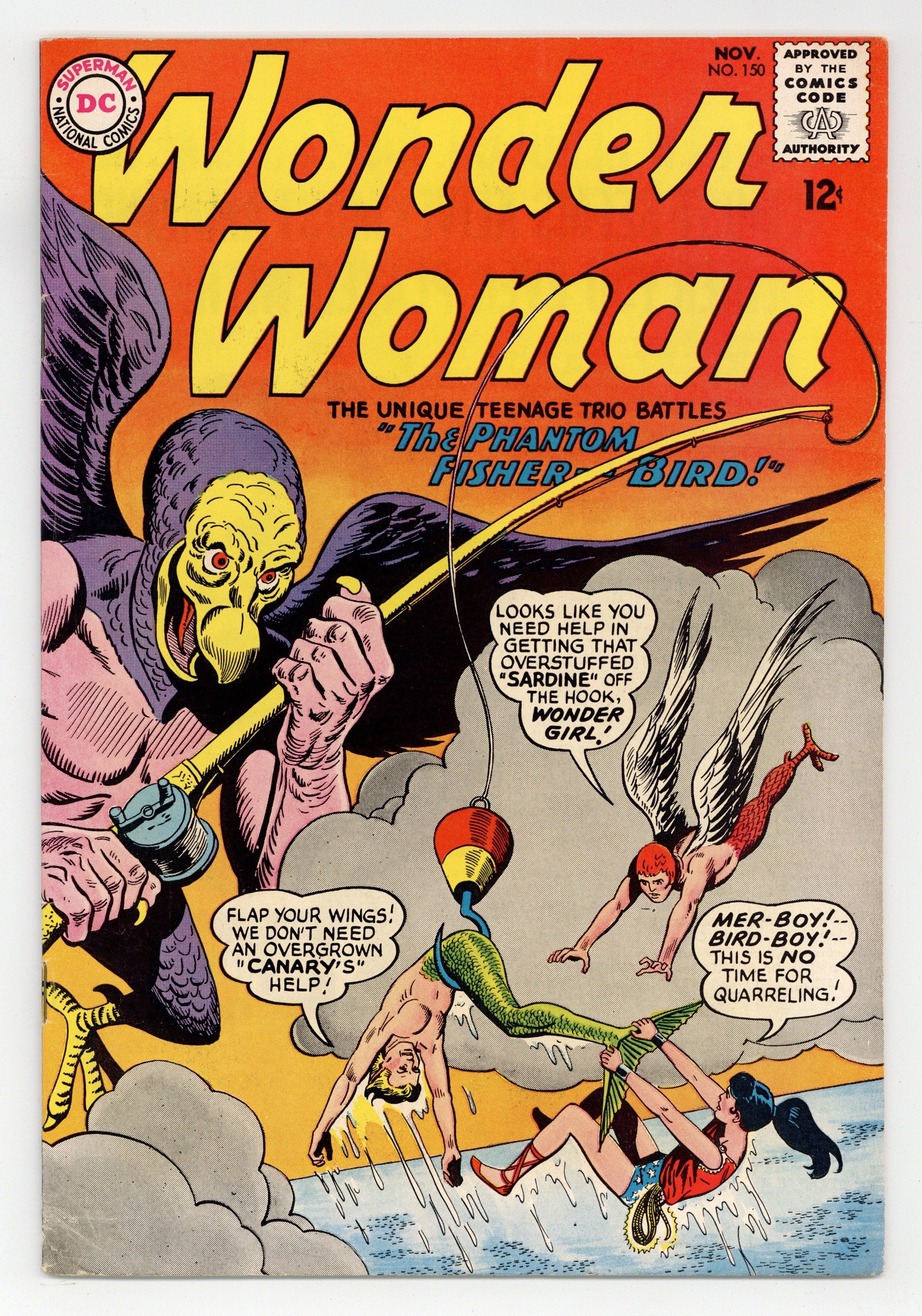 Cover pencils by Ross Andru, inks by Mike Esposito. "The Phantom Fisher-Bird," script by Robert Kanigher, pencils by Ross Andru, inks by Mike Esposito; Mer-Boy and Bird-Boy vie to see who's best which requires Wonder Girl to keep rescuing them and eventually Wonder Woman has to rescue all three of them from the King Fisherbird. Homer humor half-page by Henry Boltinoff. 36 pages, Full Color. Cover price $0.12.