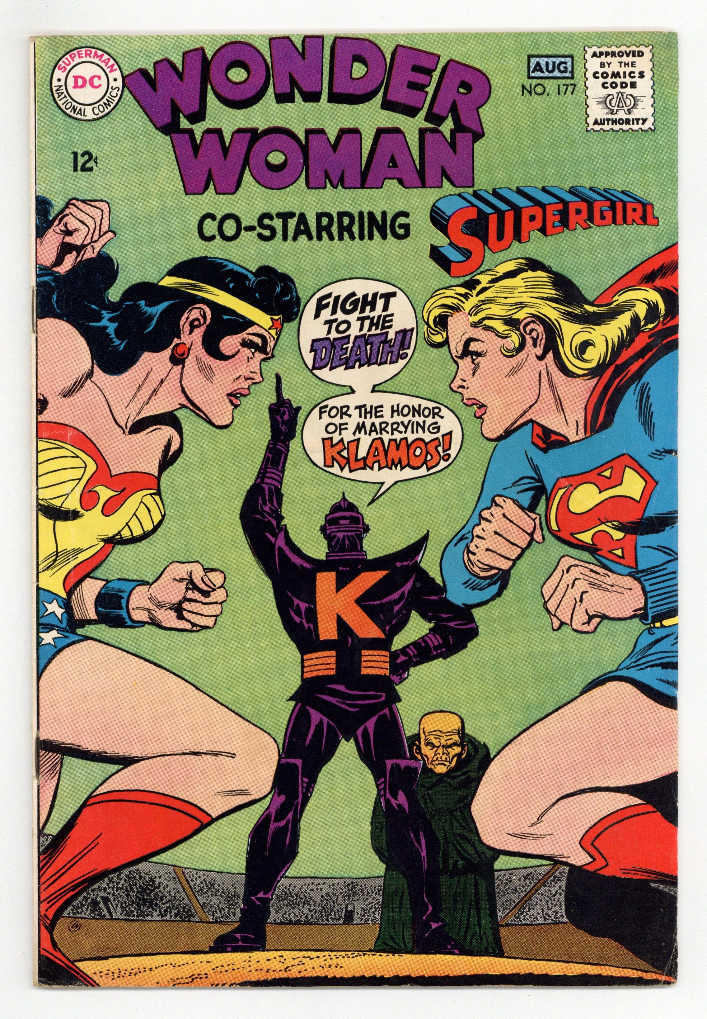 Cover pencils by Carmine Infantino (layout) and Irv Novick, inks by Irv Novick. "Wonder Woman & Supergirl vs the Planetary Conqueror," script by Bill Finger, pencils by Win Mortimer, inks by Jack Abel; An interplanetary conqueror called Klamos and his prime minister Grok are in search of a suitable queen for the monarch; To this end, they capture powerful and beautiful (by the standards of each planet) females from many worlds; From Earth they take Supergirl and Wonder Woman, capturing the former by red-sun radiation and the latter by magnetizing her bracelets together; The women contestants are set against each other in a battle royal, which at first Supergirl and Wonder Woman opt not to actively participate in, feeling that another woman will be the winner and Klamos will send both of them back home; Unfortunately, all the other candidates defeat each other, leaving only the two super-heroines. 36 pages, Full Color. Cover price $0.12.
