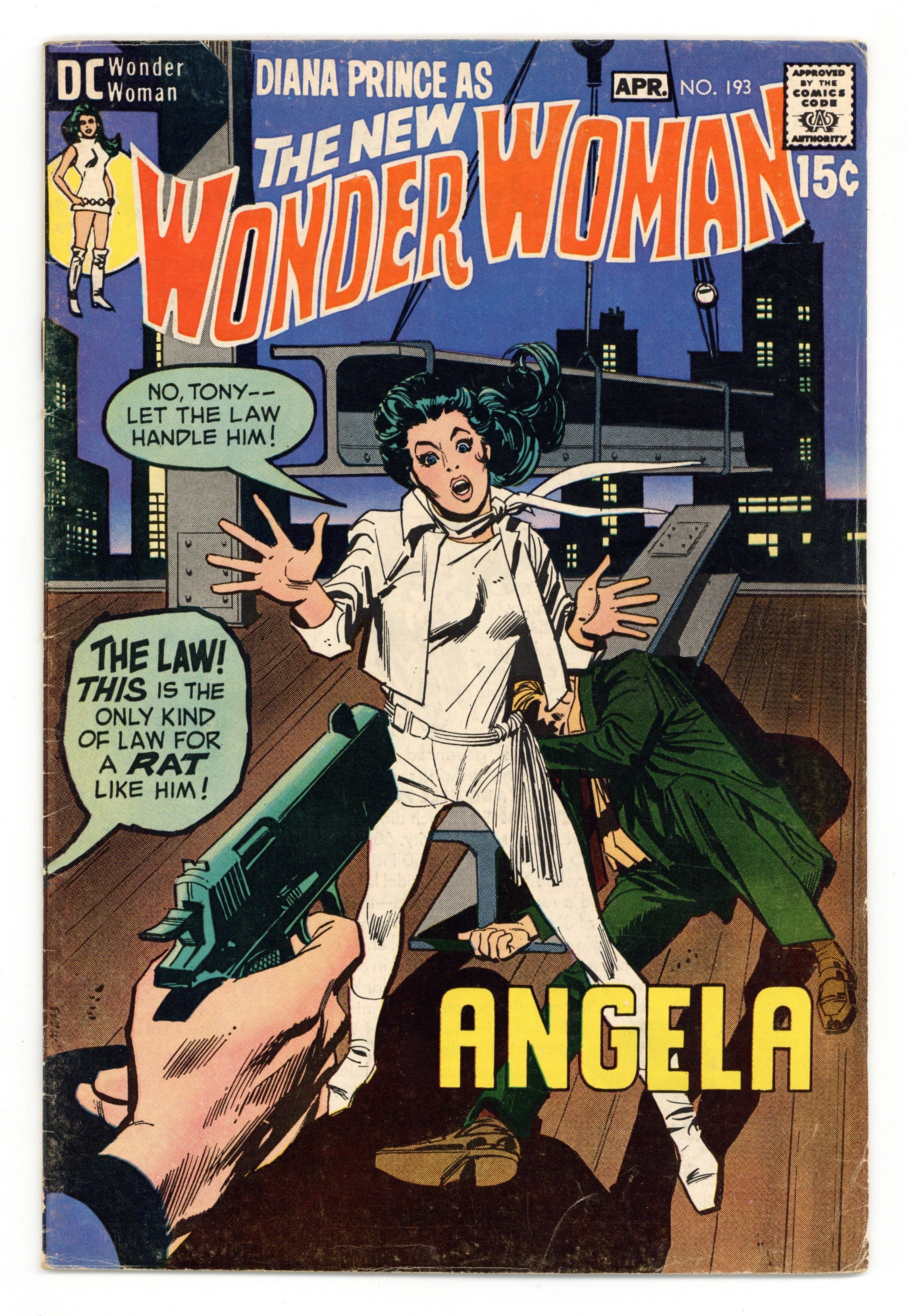 Cover pencils by Mike Sekowsky, inks by Dick Giordano. "Angela," script and pencils by Mike Sekowsky, inks by Dick Giordano; Diana Prince is asked for help by Mrs. Petrucci, mother of her friend Tony; Mrs. Petrucci reveals that her daughter Angela was rendered comatose three years ago when she had some punch at a party held by Tonys Vietnam War buddy Eddie Dean, a prankster who spiked the punch with some ingredients which, unknown to him, contained a powerful detergent; Three others died from the poisoned punch; Angela is now awake, but is mute in a nursing home and cannot recognize her mother and brother; Eddie Dean went into hiding, and Tony has been looking for him ever since. Statement of ownership - average print run 325,594; average paid circulation 172,536. 36 pages, Full Color. Cover price $0.15.