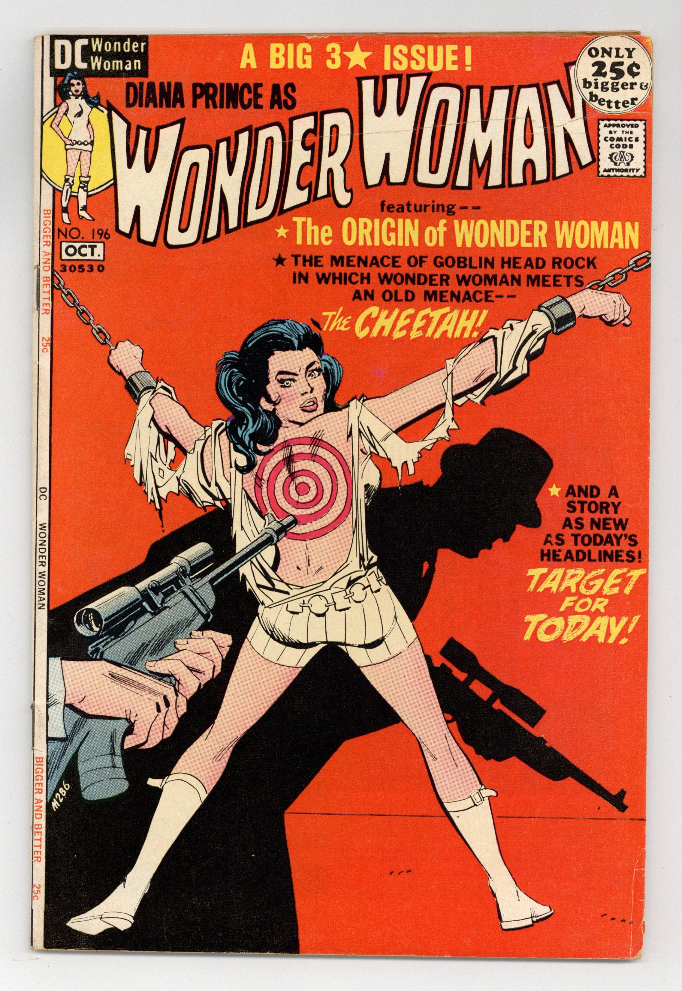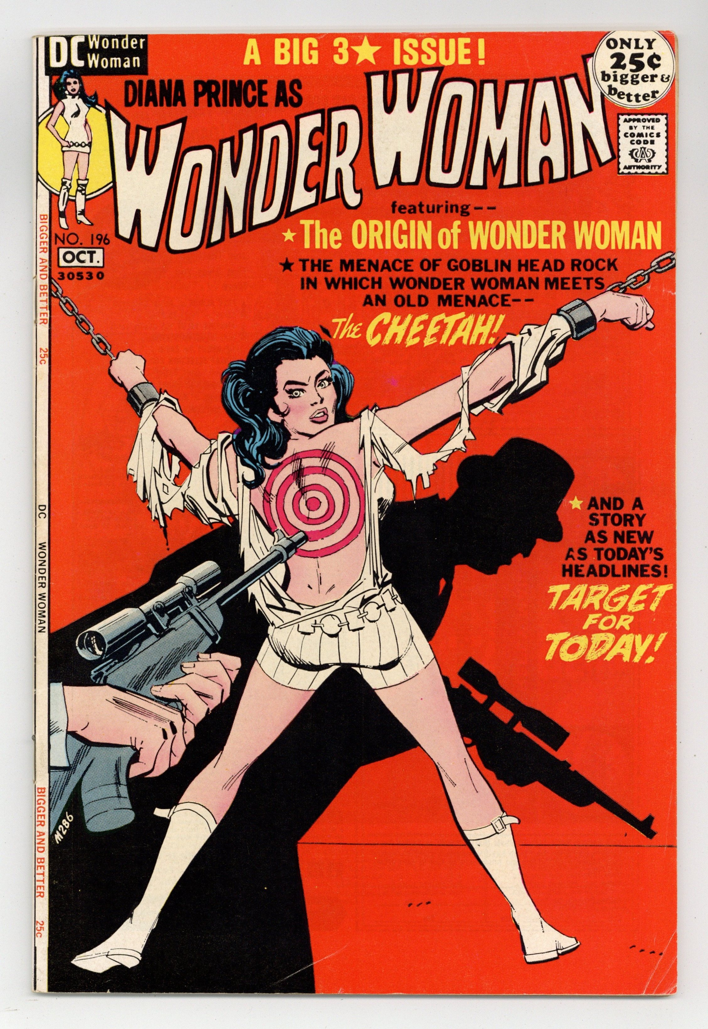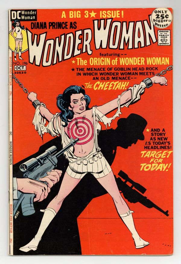 48-page giant. Cover pencils by Mike Sekowsky, inks by Dick Giordano. "Target for Today?", script and pencils by Mike Sekowsky, inks by Dick Giordano; A man dying of gunshot wounds stumbles into Dianas boutique, reveals that he is a secret agent for a government agency headed by General Stuart, for whom I-Ching also once worked, and tells her that Stuart must learn of an assassination planned on the Koronian ambassador; story from All Star #8 (6 out of the 9 pages). "Introducing Wonder Woman," script by William Marston, art by Harry G. Peter; When a man crashes on Paradise Island, the Amazons compete to see who will take him back to Man's World, and Queen Hippolyte's daughter Diana wins the competition to return him in the guise of Wonder Woman. "The Stormy Menace of Goblin Head Rock!", art by Harry G. Peter; previously unpublished Golden Age story. 52 pages, Full Color. Cover price $0.25.