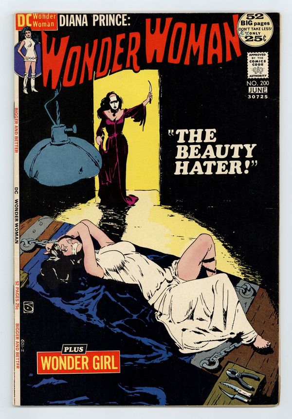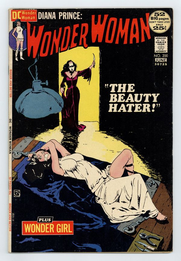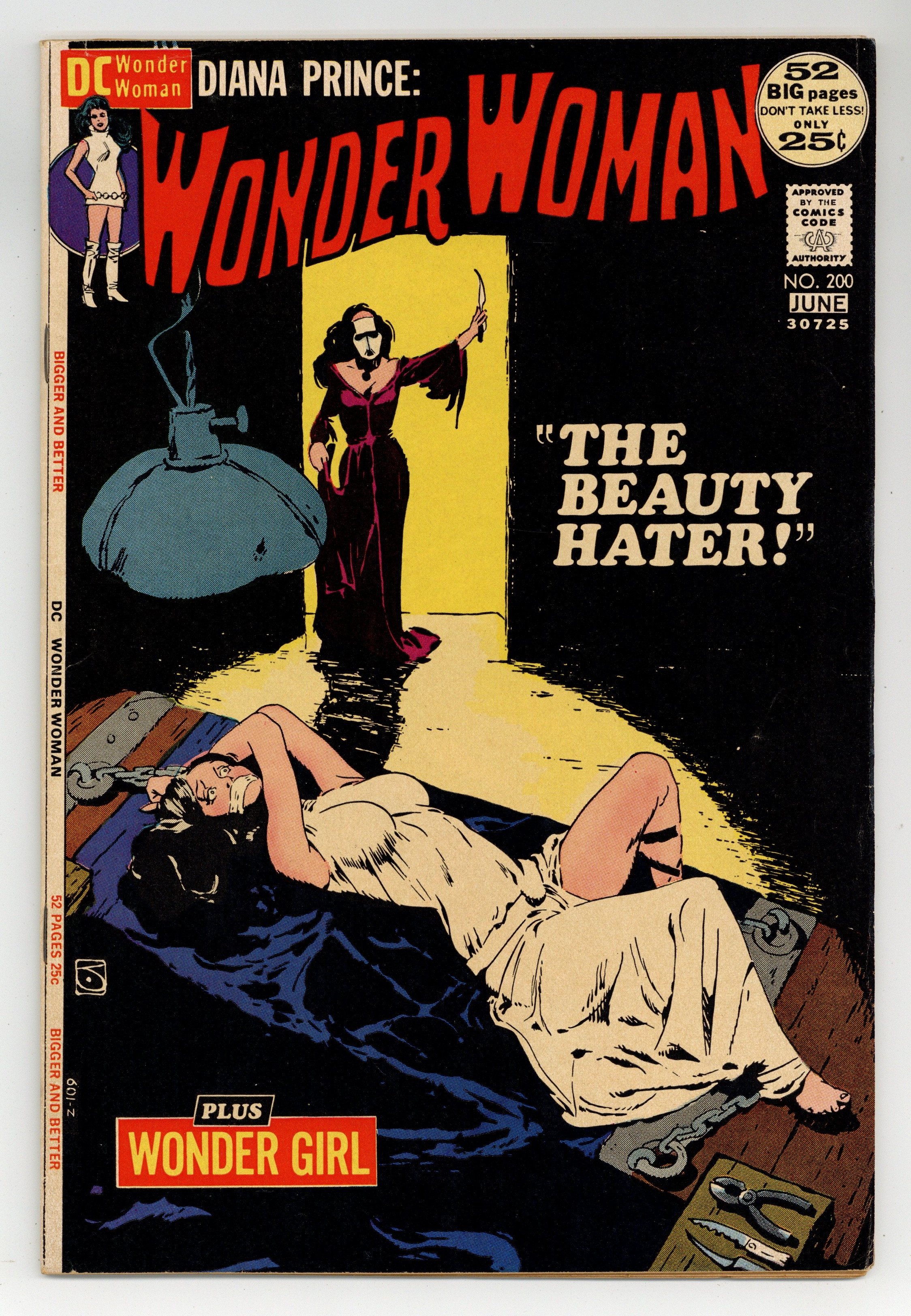 48-page giant. Cover by Jeff Jones. "The Beauty Hater," script by Denny O'Neil, art by Dick Giordano; Diana knocks Fellows Dill down, and Jonny Double takes his gun; Wonder Woman vs. Dr. Cyber and Doctor Moon. "Mer-Boy vs Bird-Boy!", script by Robert Kanigher, pencils by Ross Andru, inks by Mike Esposito; Diana Prince and I-Ching watch children playing a game of tug-of-war, and Diana remembers a time in which she played tug-of-war, with herself as the rope between Mer-Boy and Bird-Boy; The story is a non-canon Wonder Woman Family tale, reprinted from Wonder Woman #144. 52 pages, Full Color. Cover price $0.25.