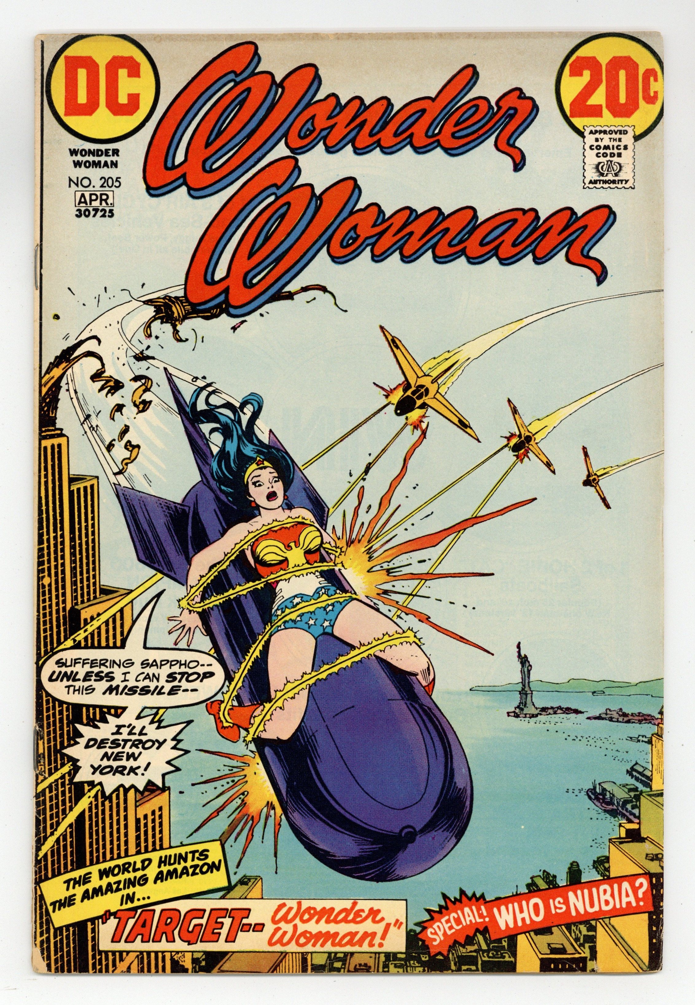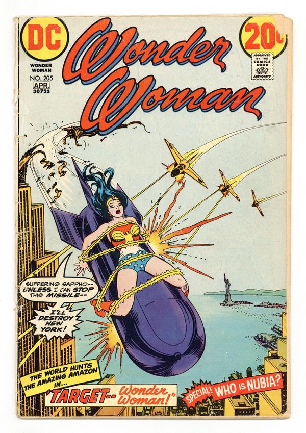 Cover by Nick Cardy. "Target Wonder Woman!", script by Robert Kanigher, pencils by Don Heck, inks by Bob Oksner; A terrorist named Dr. Domino tries to force U.N. troubleshooter Morgan Tracy to spill the knowledge of a deadly weapon by tying Wonder Woman to a missile and launching it. Half-page text describes the magic lasso, the robot plane, Wonder Woman's bracelets, and the tiara. "The Mystery of Nubia," script by Robert Kanigher, pencils by Don Heck, inks by Vinnie Colletta; On the floating island where she reigns, Nubia stops a fight between two rivals for her hand by offering to fight one of them herself. 36 pages, Full Color. Cover price $0.20.