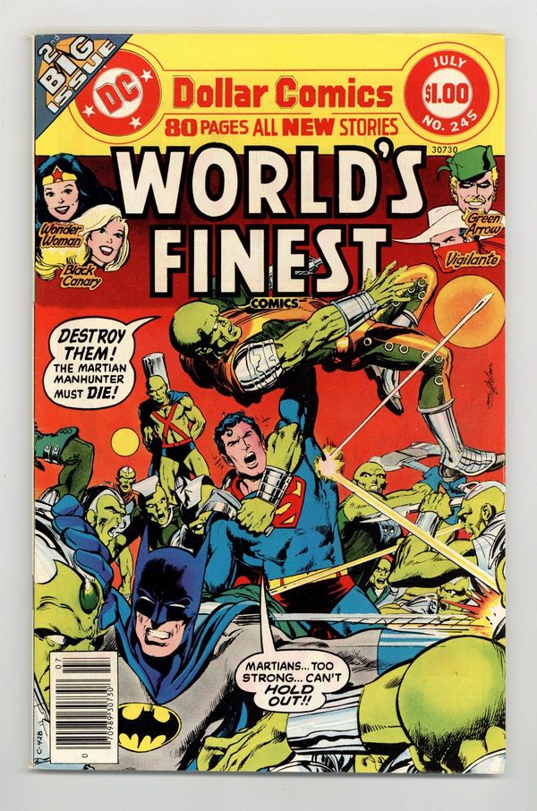Cover art by Neal Adams. Today Mars, Tomorrow the Universe starring Superman, Batman, Hawkman, and Hawkgirl, script by Bob Haney, pencils by Curt Swan, inks by Murphy Anderson; Superman, Batman, and J'onn J'onzz go to Mars II to prevent the Martians from conquering a city with deadly atmosphere. The Man-Bear Stalks at Midnight starring Green Arrow and Black Canary, script by Gerry Conway, pencils by Michael Netzer [as Mike Nasser], inks by Terry Austin. Hospital of Fear starring Black Canary, script by Gerry Conway, pencils by Michael Netzer [as Mike Nasser], inks by Terry Austin. The Plague Makers starring The Vigilante, script by Bill Kunkel, art by Gray Morrow. Hell on Skis starring Wonder Woman, script by Gerry Conway, pencils by Jim Sherman, inks by Bob Wiacek. 84 pgs. Statement of ownership--average print run 440,000; average paid circulation 196,000. 84 Pages, Full Color. Cover price $1.00.