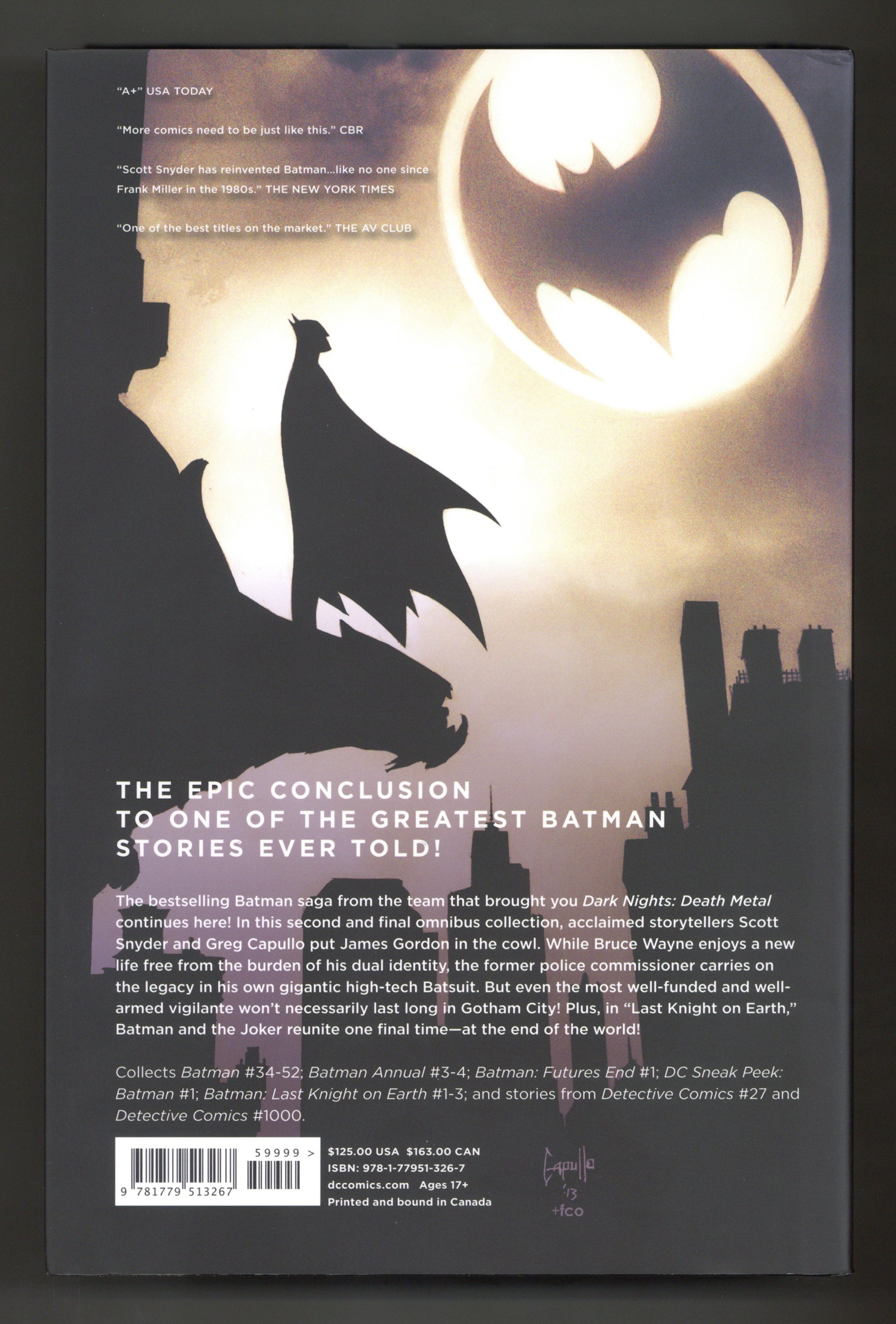 Volume 2 - 1st printing. Collects Batman (2011-2016 2nd Series) #34-52; Batman (2011-2016 2nd Series) Annual #3-4, Batman: Futures End (2014), DC Sneak Peek: Batman #1, Batman: Last Knight on Earth (2019 DC) #1-3, and stories from Detective Comics (2011-2016 2nd Series) #27, Detective Comics (2016 3rd Series) #1000.