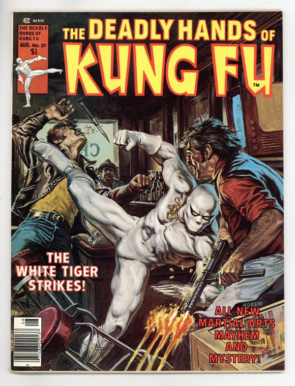 Stan Lee Presents: The Deadly Hands of Kung Fu. Cover by Earl Norem. Includes: "Enter the Letters!" A letters page with readers' thoughts on previous issues. An editorial by John Warner. The Sons of the Tiger and White Tiger star in "Death is a Game Called Handball!" Story by Bill Mantlo. Art by Ron Wilson and the Tribe. "The Good, the Bad, and the Traditional!" An article about martial artist Fred Hamilton by Val Eads. "The Junior Judoka Chronicle!" Dan Hagen takes a look at the up and coming stars of judo. "Fighting Arts Review!" A column by David Kraft. Plus, "Swordquest: The Ninja Conspiracy!" Part 3. Story by John Warner. Art by Tony DeZuniga. Includes a B&W poster by Mike Nasser and Neal Adams featuring White Tiger. Black and white. Cover price $1.00.