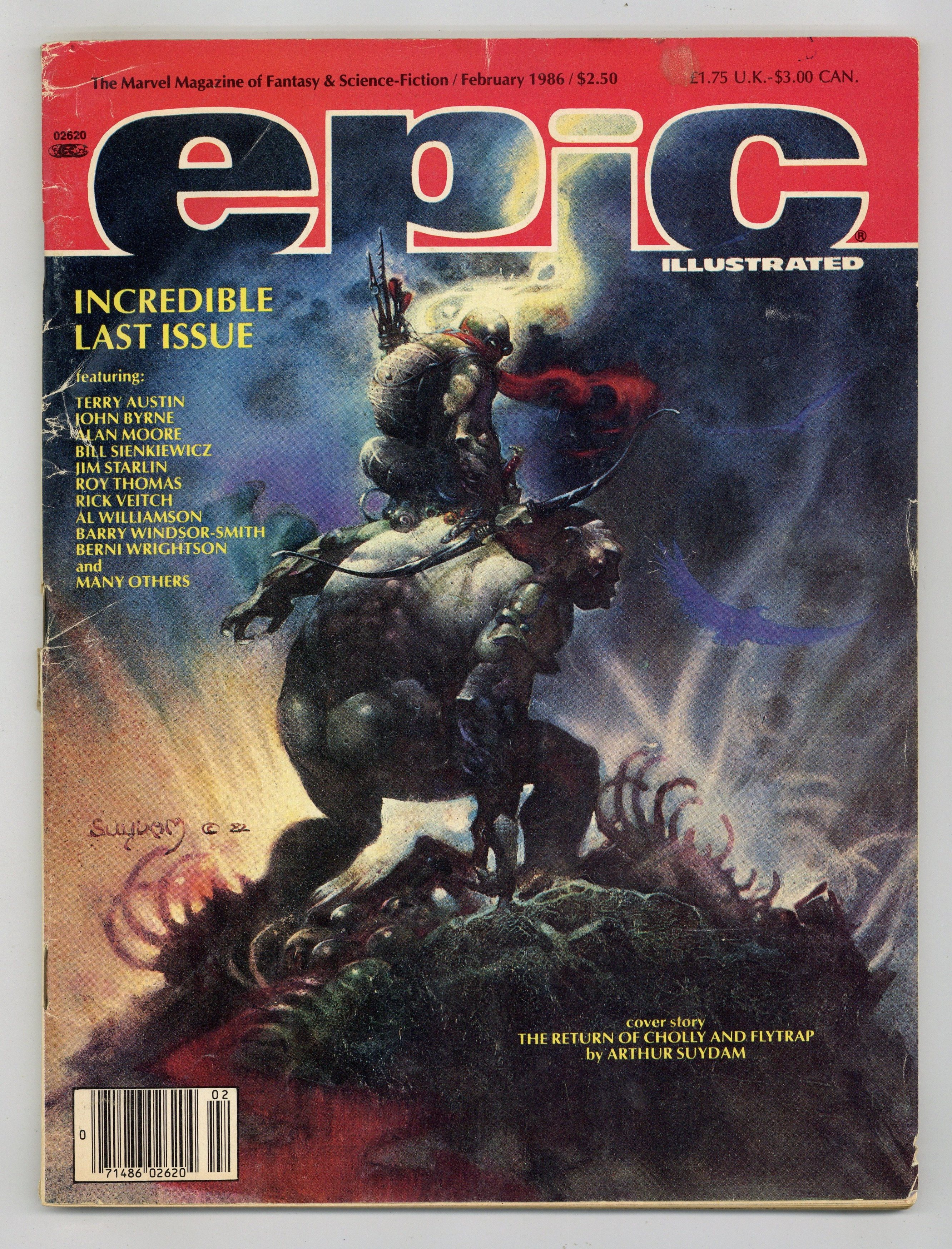 Final Issue; Cholly & Flytrap Cover by Arthur Suydam; "The Beast" by Paolo Eluteri Serpieri; "Love Doesn't Last Forever" by Alan Moore & Rick Veitch; "Works in Progress" by Barry Windsor-Smith; "Out of Phase" by Archie Goodwin & Al Williamson; "Doctor Watchstop: Wasting Time" by Ken Macklin; "The Last Galactus Story: Chapter Nine" by John Byrne (story & art), Terry Austin (inks) & Glynis Oliver (colors); "Horizon Lights" by Jo Duffy & T. Sagara; "They Just Fade Away" by Berni Wrightson; "The Return of Cholly & Flytrap" by Arthur Suydam; "Amber 1" by Jim Starlin; "Death of a Legend" a story of the final days of Robert E. Howard by Roy Thomas & S. Plunkett; "Slow Dancer" by Bill Sienkiewicz; Submissions from the Atlanta Fantasy Fair Competition; Cover price $2.50.