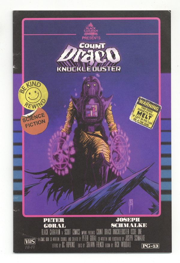 Published Jul 2021 by Scout Comics.$3.00Written by Joseph Schmalke, Peter Goral. Art and Cover by Joseph Schmalke. Black Caravan Imprint: The Curse of the Cryptocrystalline Stone continues in 2021! Follow the Cosmic Ghoul Warrior and young psychic, Acele Aerglo, as they embark on the next chapter of an adventure that will take them from the vastness of The Void to the depths of an aquatic moon crawling with fantastic creatures! This action-packed tale of sinister celestial sorcery continues, this time told from behind the mask of the mysterious and malevolent Count Draco Knuckleduster and his Cybernetic Chrononautical Exosuit! Can the curse be broken in time... or is it already too late? 32 pages, full color. Cover price $3.99.