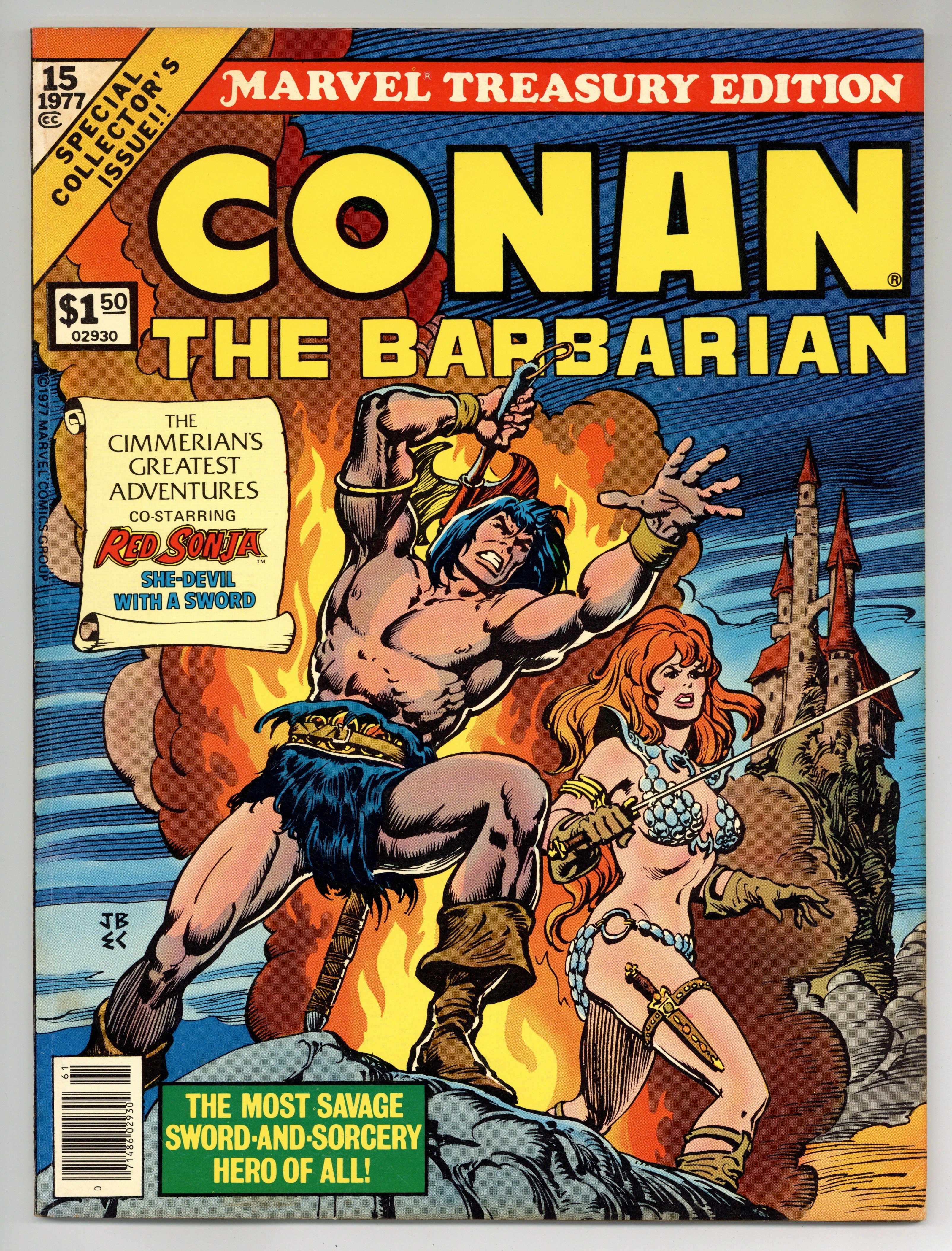 Marvel Treasury Edition (1974) #15 features Conan the Barbarian. This issue features one of the Cimmerian's greatest adventures with Red Sonja the She-Devil with a Sword. All stories by Roy Thomas. Includes "The Song of Red Sonja" art by Barry Windsor Smith, "Night of the Dark God" art by Gil Kane and Neal Adams, and "Black Colossus" art by John Buscema and Alfredo Alcala. Plus, three Red Sonja pin-ups by Frank Thorne, Dick Giordano, and Estaban Maroto. 80 pages. Cover price $1.50.