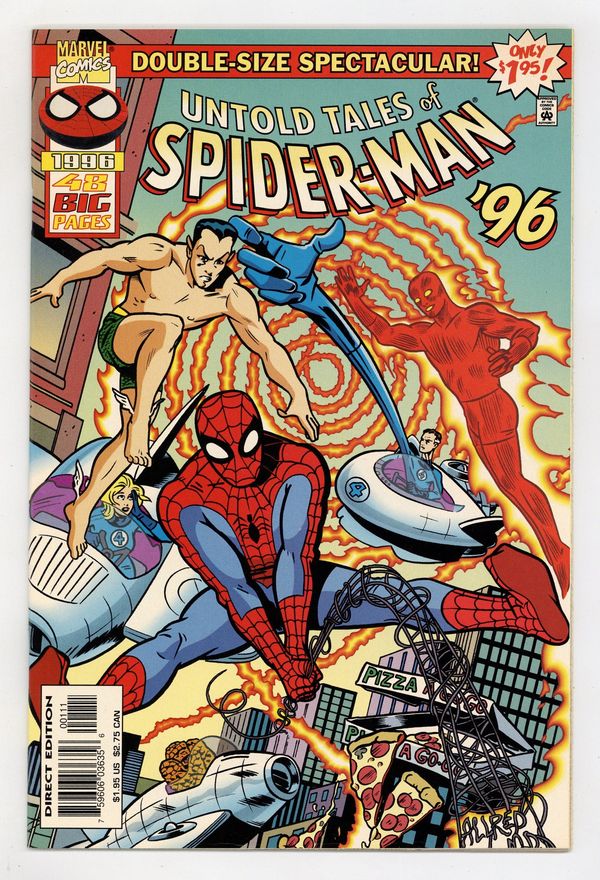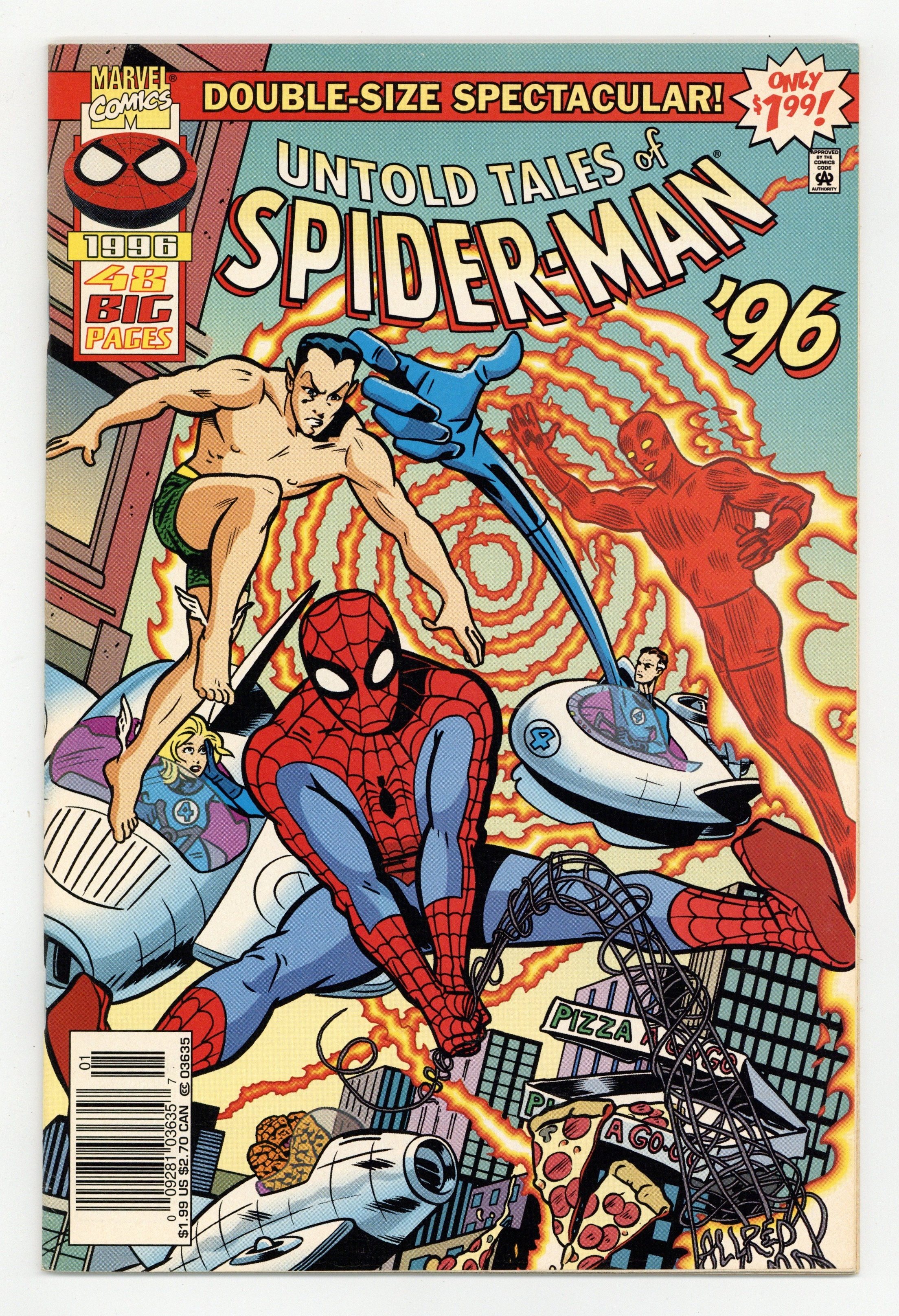 Spider-Man's date with the Invisible Girl irks the Human Torch, but it makes the Sub-Mariner really mad in "A Night on the Town!" Written by Kurt Busiek. Art by Mike Allred & Joe Sinnott. Plus the 3-page "How Kurt Busiek and Pat Olliffe Re-create Untold Tales," the 4-page "A Guided Tour to the World of Untold Tales" by Busiek & Olliffe, the 1-page "Recipe for Aunt May's Wheatcakes" and a gallery of Spider-Man's foes: The Undertaker by Sal Buscema, Joey Pulaski by Jim Mooney, Supercharger by Gil Kane, The Scorcher by Pat Olliffe and Klaus Janson, Batwing by Mike Wieringo and Cam Smith, The Spacemen by Mark Bagley \and Mark Farmer, The Wizard by Ron Frenz and Sal Buscema. Cover by Allred. Cover price $1.95.