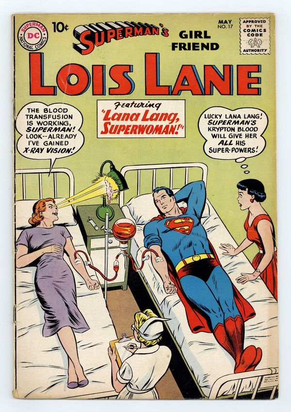 Cover pencils by Curt Swan, inks by Stan Kaye and Kurt Schaffenberger (Lois' head). The Girl that Almost Married Clark Kent!, script by Robert Bernstein, art by Kurt Schaffenberger; Doris Drake recieves an amulet from an Indian Fakir that allows her to read minds; She finds out Superman's secret identity and sets out to marry Clark Kent. Lana Lang, Superwoman!, script by Jerry Siegel, pencils by Curt Swan, inks by Stan Kaye; Superman uses a blood transfusion to give both Lois and Lana super powers. How Lois Lane Got Her Job, script by Otto Binder, art by Kurt Schaffenberger; Lois remembers three scoops she got before she met Superman. Honey in Hollywood humor page by Henry Boltinoff. 36 Pages, Full Color. Cover price $0.10.