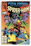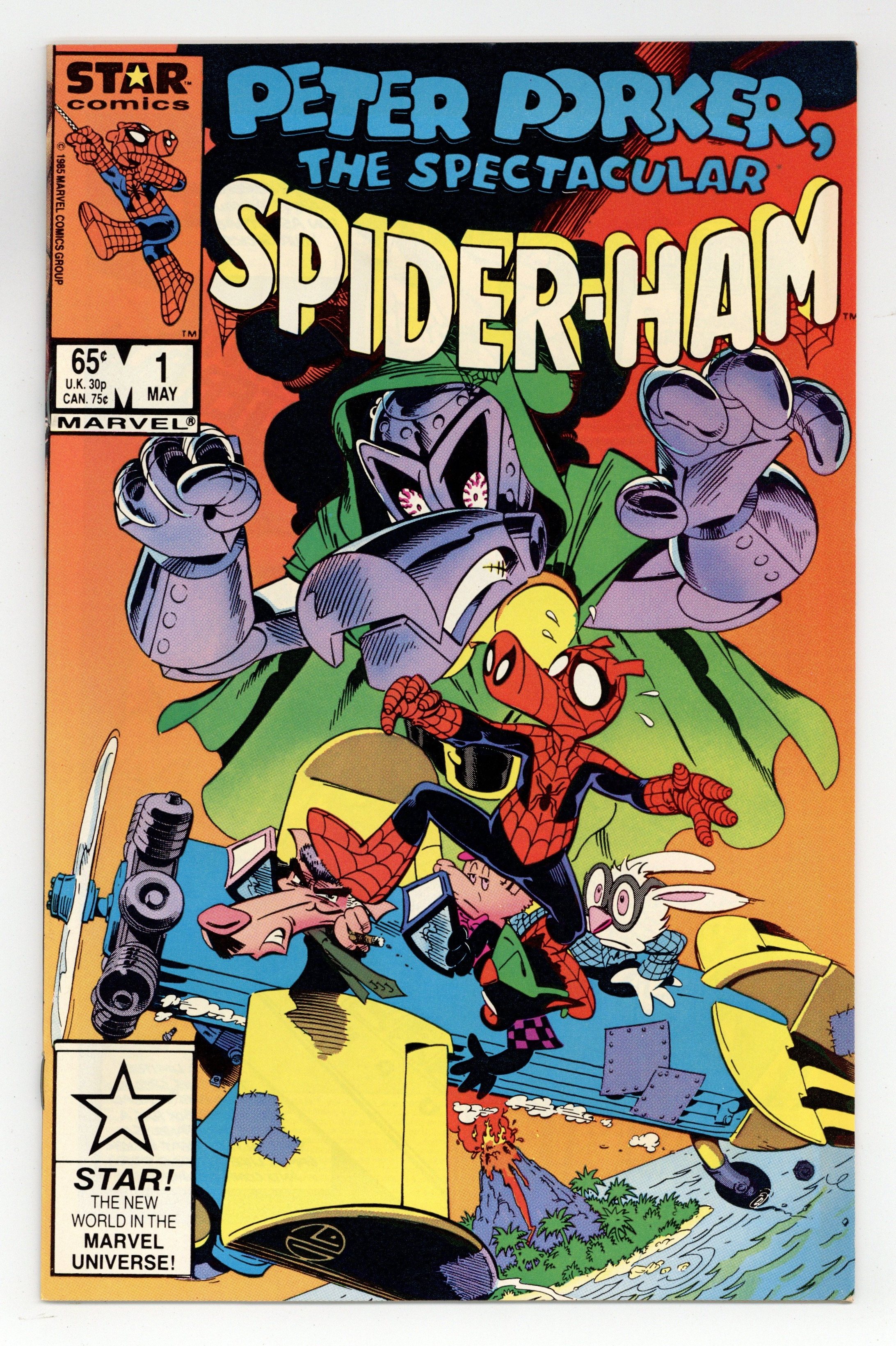 Published May 1985 by Marvel/Star Comics.$19.25Direct Edition. J. Jonah Jackal, Chief editor of the Daily Beagle, Peter Porker, ace photographer, and three junior news trainees head off to investigate the St. Croix Trapezoid. However, their flight runs afoul and they crash land on the island home of the most nefarious super-villain of all...Ducktor Doom. Can the Spectacular Spider-Ham defeat the greatest enemy of the Fantastic Furs, save his friends and boss, get the front-page picture, and still keep his secret identity a secret? Brought to you in the hilarious tradition of the Looney Tunes, here comes the Spectacular Spider-Ham. Story by Steve Skeates. Art by Mark Armstrong and Joe Albelo. 32 pages. Cover price $0.65.