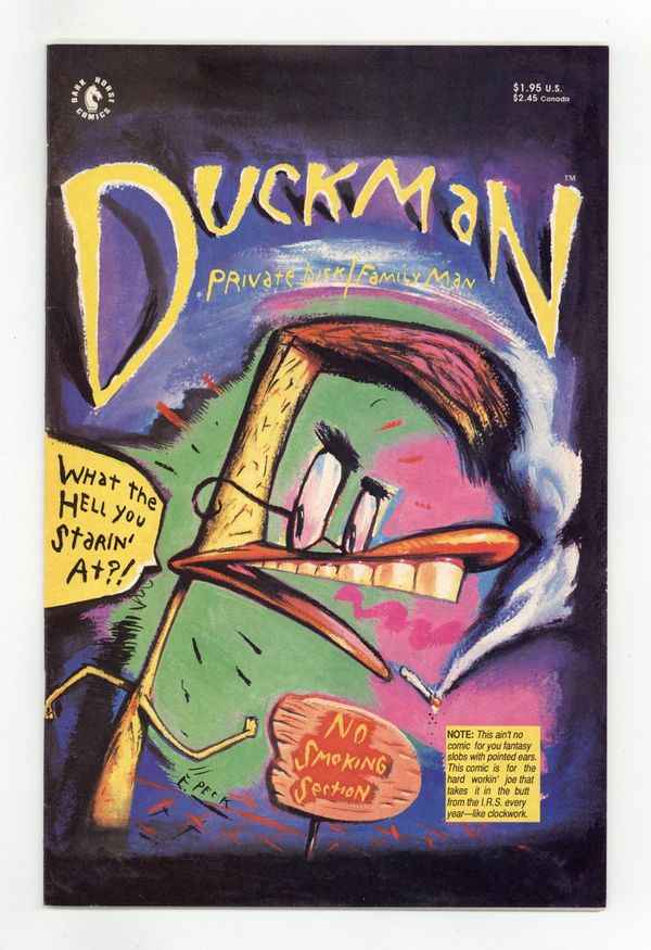 Story and art by Everett Peck. He's been up--he's been down--he's fallen asleep with the TV on! New, hot from this previous engagement in Dark Horse Presents, the tough duck private dick, stars in his first feature length special. The story wouldn't be complete without Cornfed, Fluffy, and Uranus hanging around waiting for the next dose of abuse from their feathered "friend." 32 pages, B&W. Cover price $1.95.