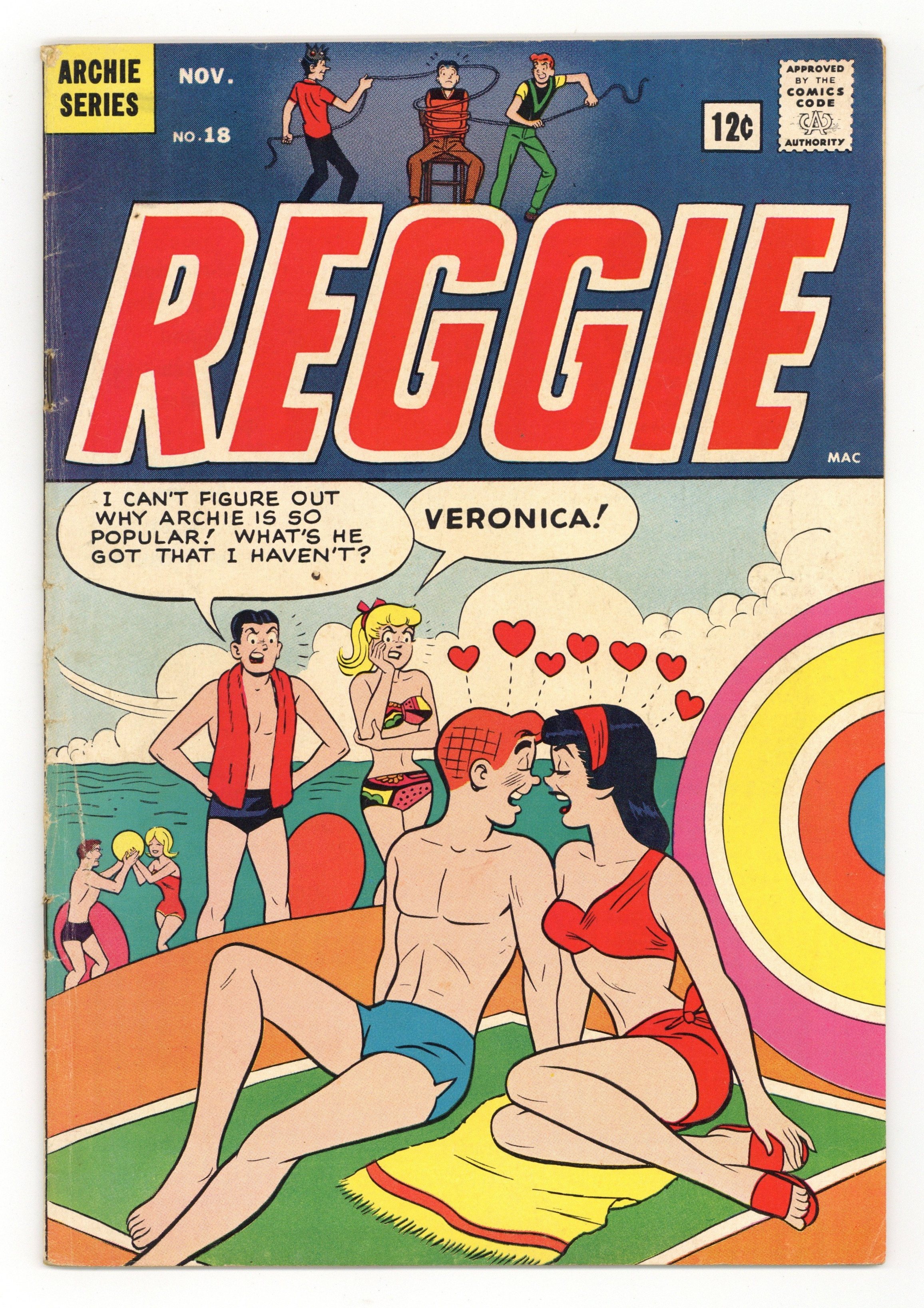 "Poise Will Be Poise," pencils by Dan DeCarlo, inks by Rudy Lapick; Reggie, with Betty's complicity, plays a series of dirty tricks on Archie to make it look to Veronica like he has no grace and poise. "A Tough Walk!", script and art by Joe Edwards; Jinx isn't afraid of the biggest bully on the block, because she's walking the biggest dog on the block. "Service with a Smile"; Reggie demands that Jughead serve up the last scoops of ice cream in a deep vat. "Imagination," script by Jim Ruth, art by Bill Vigoda; Archie thinks it's possible to project his imagination; Reggie makes a weird costume for a young boy and pays him to walk by Archie so that Archie will think that he projected an image; Jughead steps in to double-cross Reggie. The World of Jughead ad. "Bound to Agree"; Archie needs to borrow $5 so he can date Veronica. Reggie will lend the money, but first Archie must sign an agreement that he can't ask her for a date until he pays the money back; Reggie presses his luck too far when he tells Veronica that Archie is waiting for her to ask him to the dance. "The Ego and I," pencils by Bill Vigoda; Betty tells Reggie that he's self-centered and boastful. "Sore Winner," pencils by Bill Vigoda; Reggie asks a waiter if he's willing to flip a coin for his tip--double or nothing. "Mastodon" article. "The Old Bawl Game," script by Frank Doyle, pencils by Harry Lucey; Archie tells Betty that he doesn't like women crying; Since Veronica is home sick with a cold, Reggie and Betty come up with a scheme to have Veronica crying when Archie comes to visit. 36 pgs., full color. Cover price $0.12.