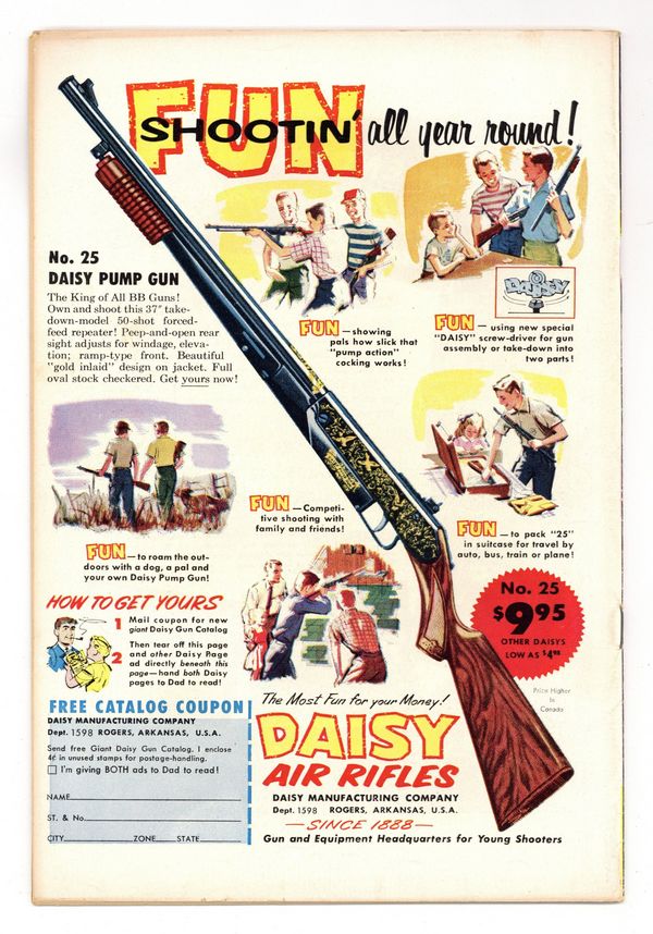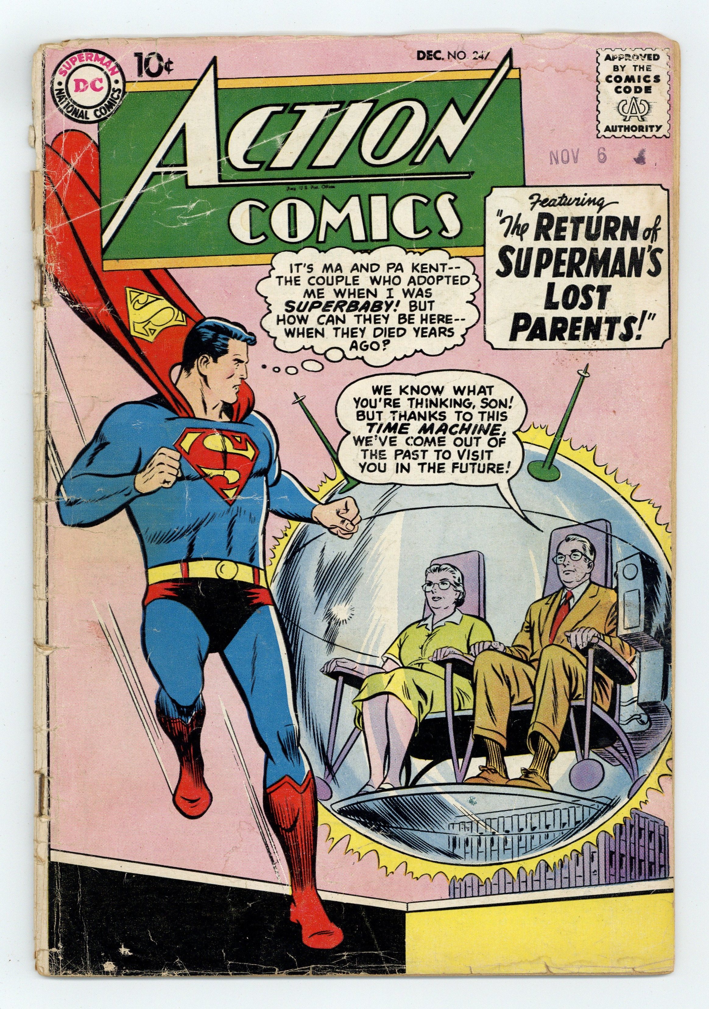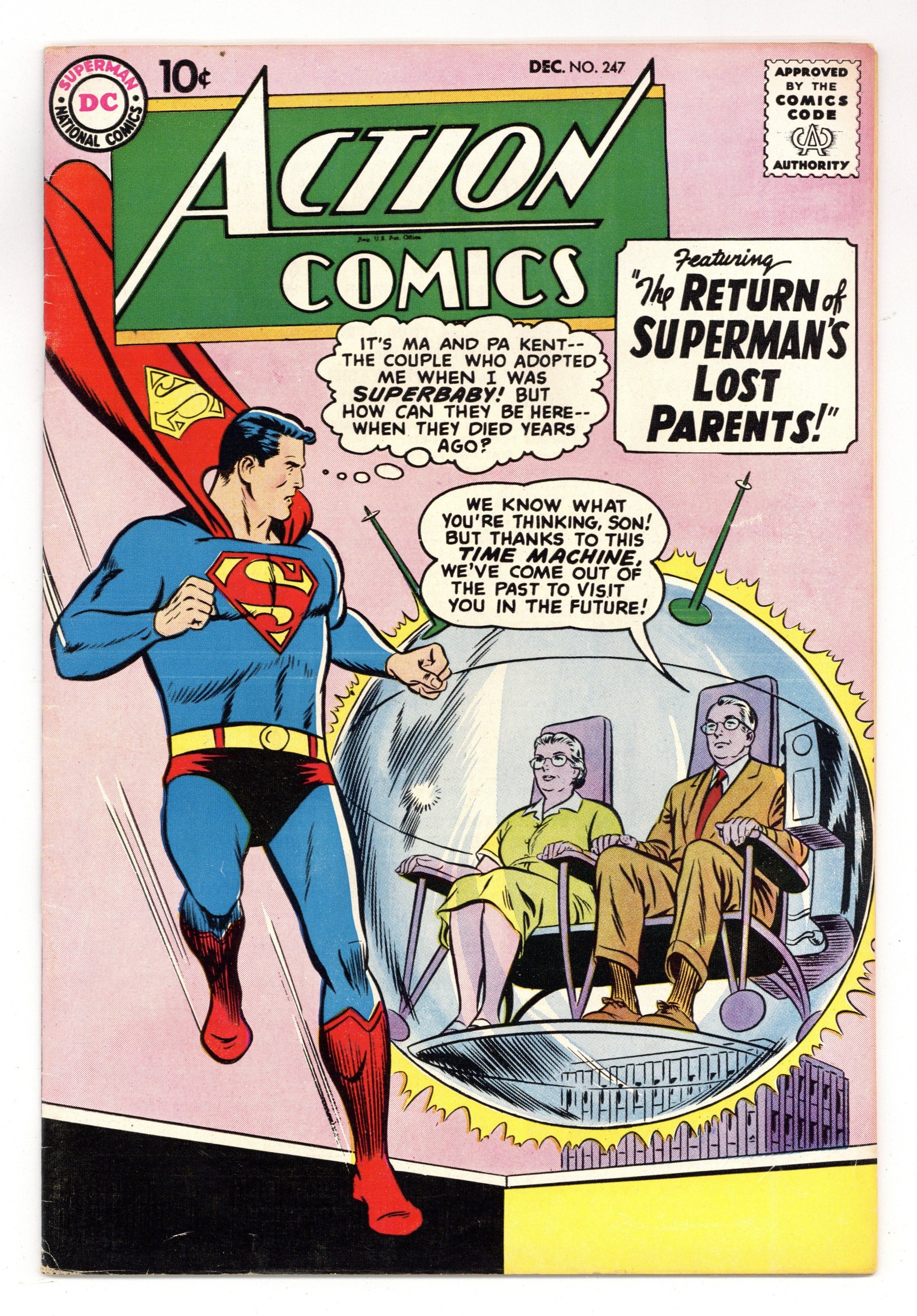 Cover pencils by Curt Swan, inks by Stan Kaye. "Superman's Lost Parents!", script by Otto Binder, art by Al Plastino; Ma and Pa Kent seemingly arrive in the present in a time bubble, and Superman is so happy to see them that he shows them all the secrets of his adult life; But Ma and Pa turn out to be con artists who blackmail Superman with the knowledge of his double identity secret. Operation Blackhawks! ad. "Tommy Tomorrow, Space Convict X-146-93," script by Otto Binder, art by Jim Mooney; Tommy Tomorrow is arrested as an impostor and thrown into an interplanetary prison. 2/3-page Shorty story by Henry Boltinoff. Supermen of America ad. "The Riddle of the Super-Zoo!", script by Jack Miller, art by Howard Sherman; Congo Bill and Janu work to turn the tables on Jungle Joe, a swindler who sells animals that can supposedly perform fantastic feats. 36 Pages, Full Color. $.10 Cover price $0.10.