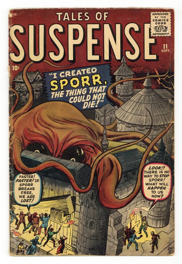 Cover pencils by Jack Kirby, inks by Dick Ayers. "I Created... Sporr! The Thing That Could Not Die!", pencils by Jack Kirby, inks by Dick Ayers; A scientist moves into Dr. Frankenstein's castle to set up his experimental growth ray; When he trains it upon an amoeba, the frightened villagers burst in, and seeing the equipment, think he is going to bring ruin down upon them and hustle him off to the town jail. "The Thread" text story. "I Know the Secret of the Flying Saucer!", art by Steve Ditko; 150 Martian flying saucers land on Earth, but do nothing after landing; Since no pilots emerge the natives transport the craft to military bases where their hulls are experimented upon, but cannot be penetrated. "Beware the Eyes of Igor!", art by Paul Reinman; A hypnotist uses his power to rob a movie theatre, but accidentally hypnotizes himself and forgets the whole plan. "I Escaped to Another World!", art by Don Heck; A prisoner escapes and uses a time machine to travel into the past, but he accidentally kills his own ancestor, erasing himself. 36 pages, full color. Cover price $0.10.