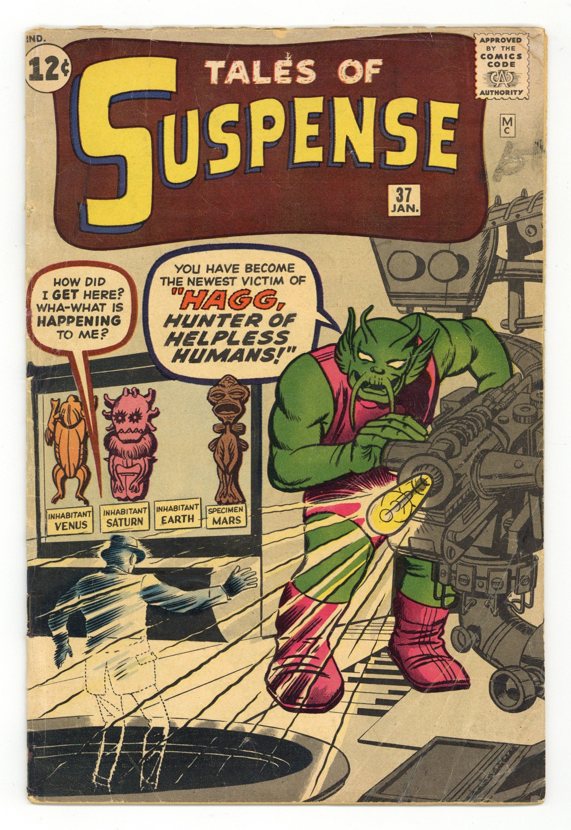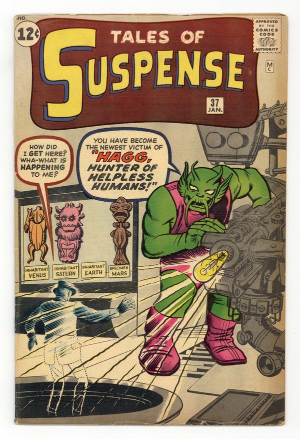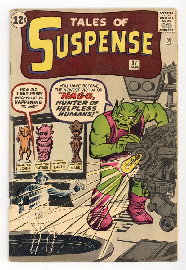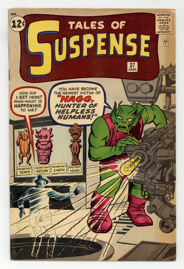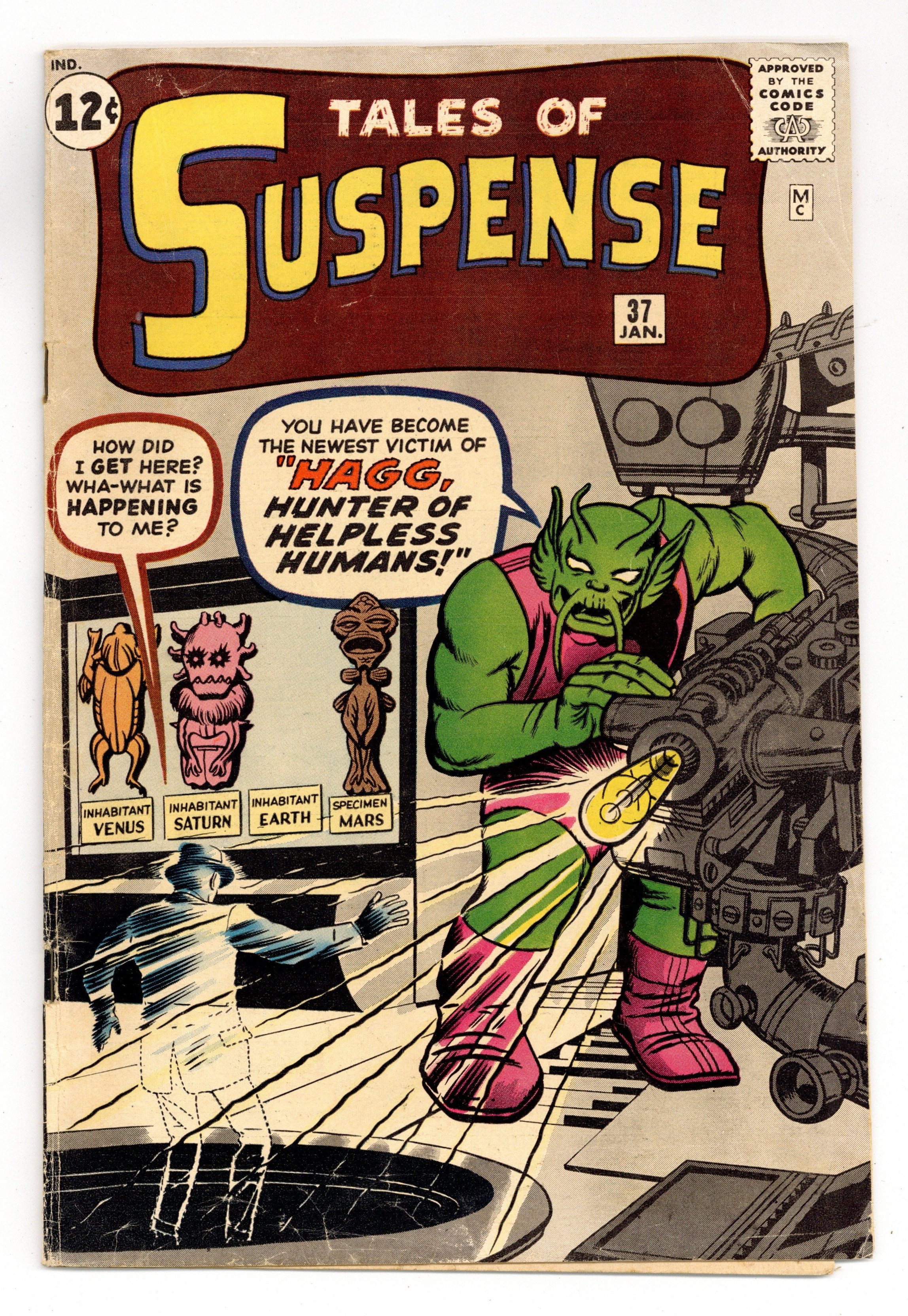 Cover pencils by Jack Kirby, inks by Dick Ayers. "Haag! Hunter of Helpless Humans!", script by Stan Lee (plot) and Larry Lieber (script), art by Steve Ditko; An alien hunter named Haag comes to earth looking for new game to hunt and sets out to capture humans from around the world. "Muscle Man" text story. "A Voice in the Dark," script by Stan Lee (plot) and Larry Lieber (script), art by Paul Reinman; A crook hides in a wax museum, but he is scared off by a phonogram record. The curator finds the record, but no one except the statues could have turned it on. "Behold - the Monster!", script by Stan Lee, art by Steve Ditko; A publicity agent has a large paper machete monster created to promote a new movie but is despondent when his boss criticizes him for public complaints the object is generating; Unknown to anyone on Earth, an alien invasion force is drawing near when its commander orders the viewscreen to display a typical Earth creature so they will know what to expect. 36 pgs., full color. $0.12. Cover price $0.12.