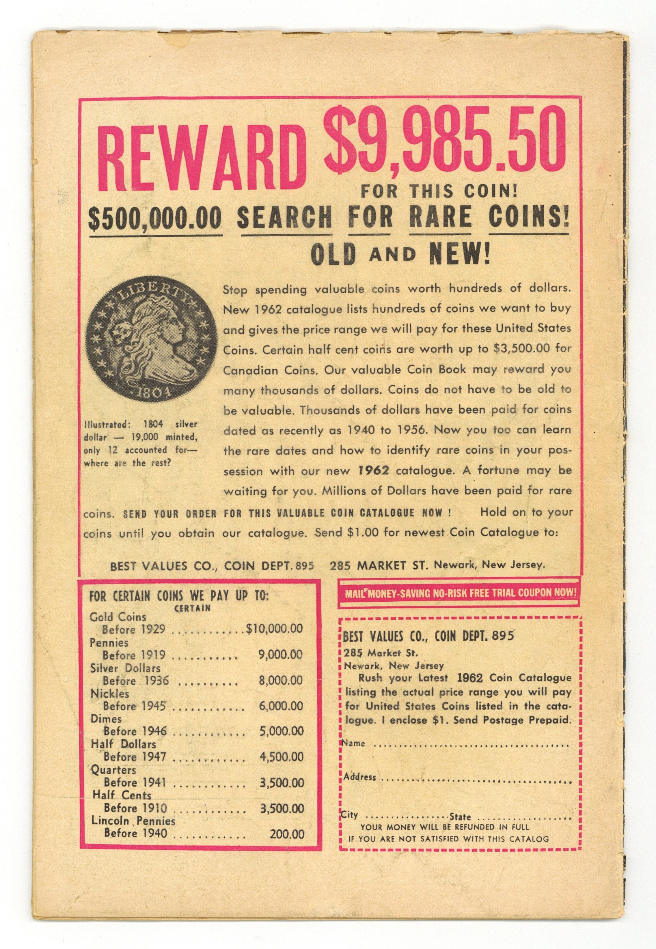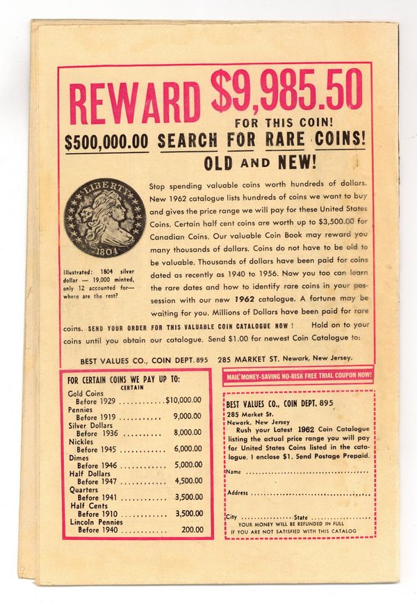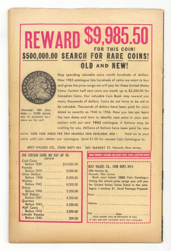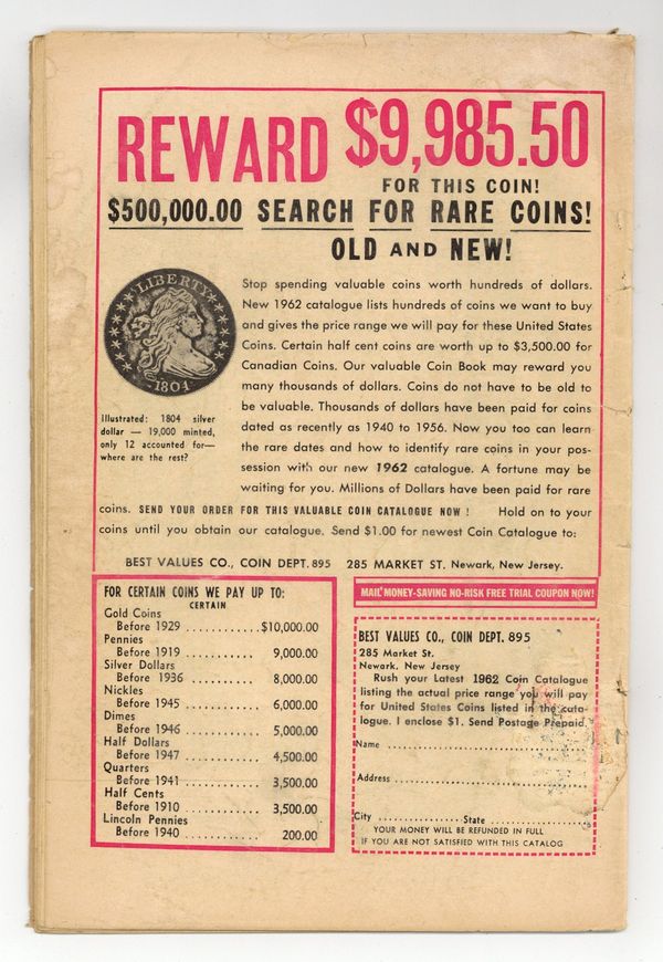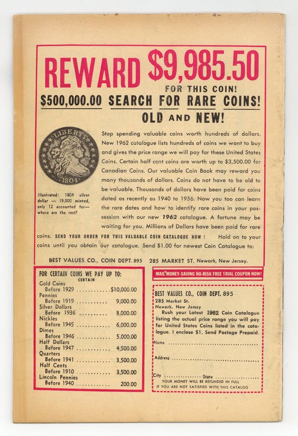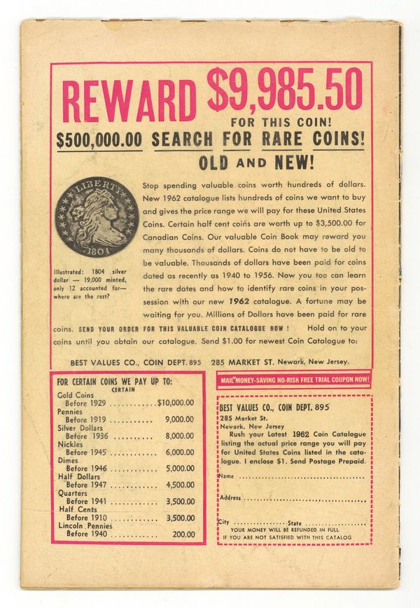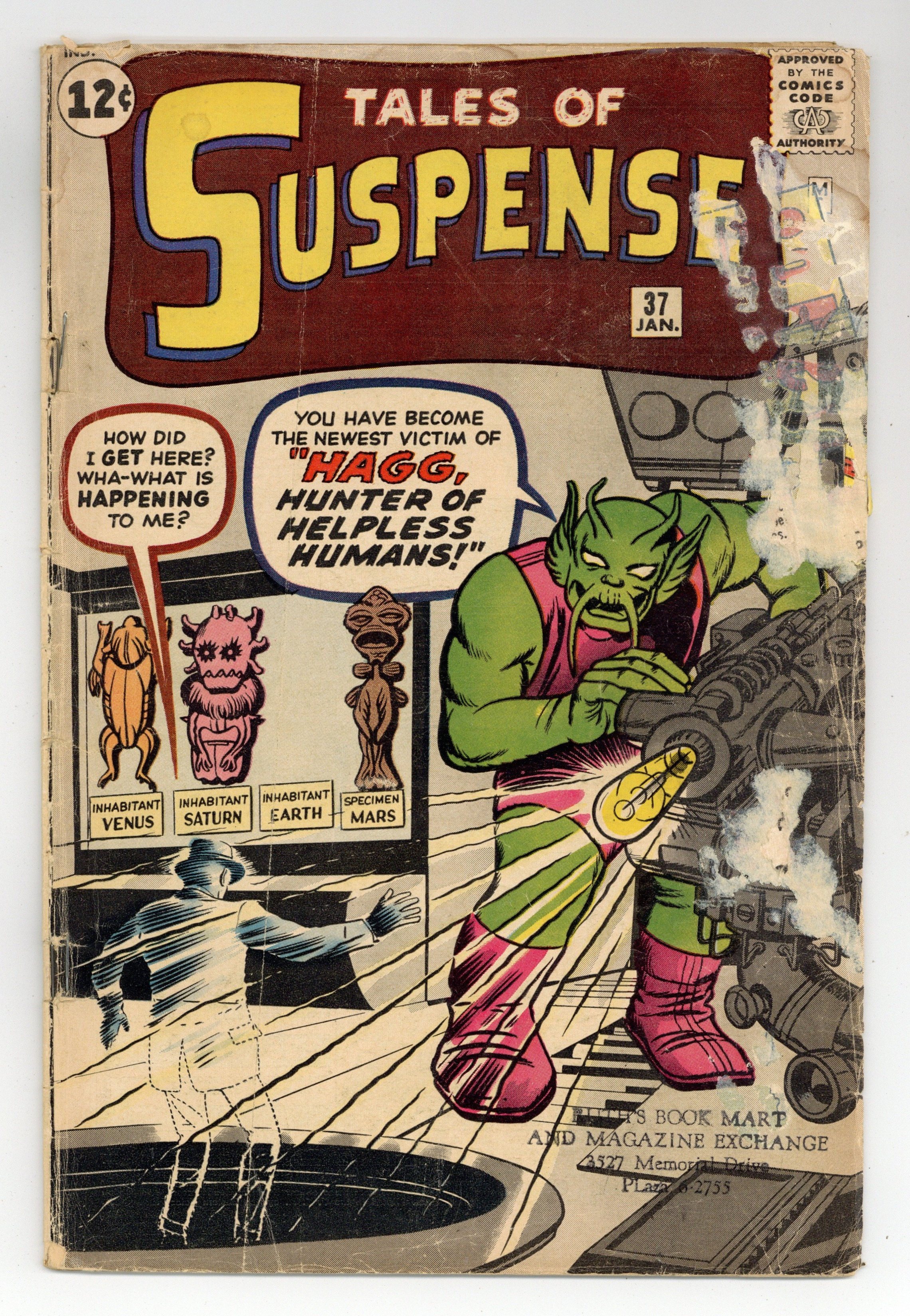 Cover pencils by Jack Kirby, inks by Dick Ayers. "Haag! Hunter of Helpless Humans!", script by Stan Lee (plot) and Larry Lieber (script), art by Steve Ditko; An alien hunter named Haag comes to earth looking for new game to hunt and sets out to capture humans from around the world. "Muscle Man" text story. "A Voice in the Dark," script by Stan Lee (plot) and Larry Lieber (script), art by Paul Reinman; A crook hides in a wax museum, but he is scared off by a phonogram record. The curator finds the record, but no one except the statues could have turned it on. "Behold - the Monster!", script by Stan Lee, art by Steve Ditko; A publicity agent has a large paper machete monster created to promote a new movie but is despondent when his boss criticizes him for public complaints the object is generating; Unknown to anyone on Earth, an alien invasion force is drawing near when its commander orders the viewscreen to display a typical Earth creature so they will know what to expect. 36 pgs., full color. $0.12. Cover price $0.12.