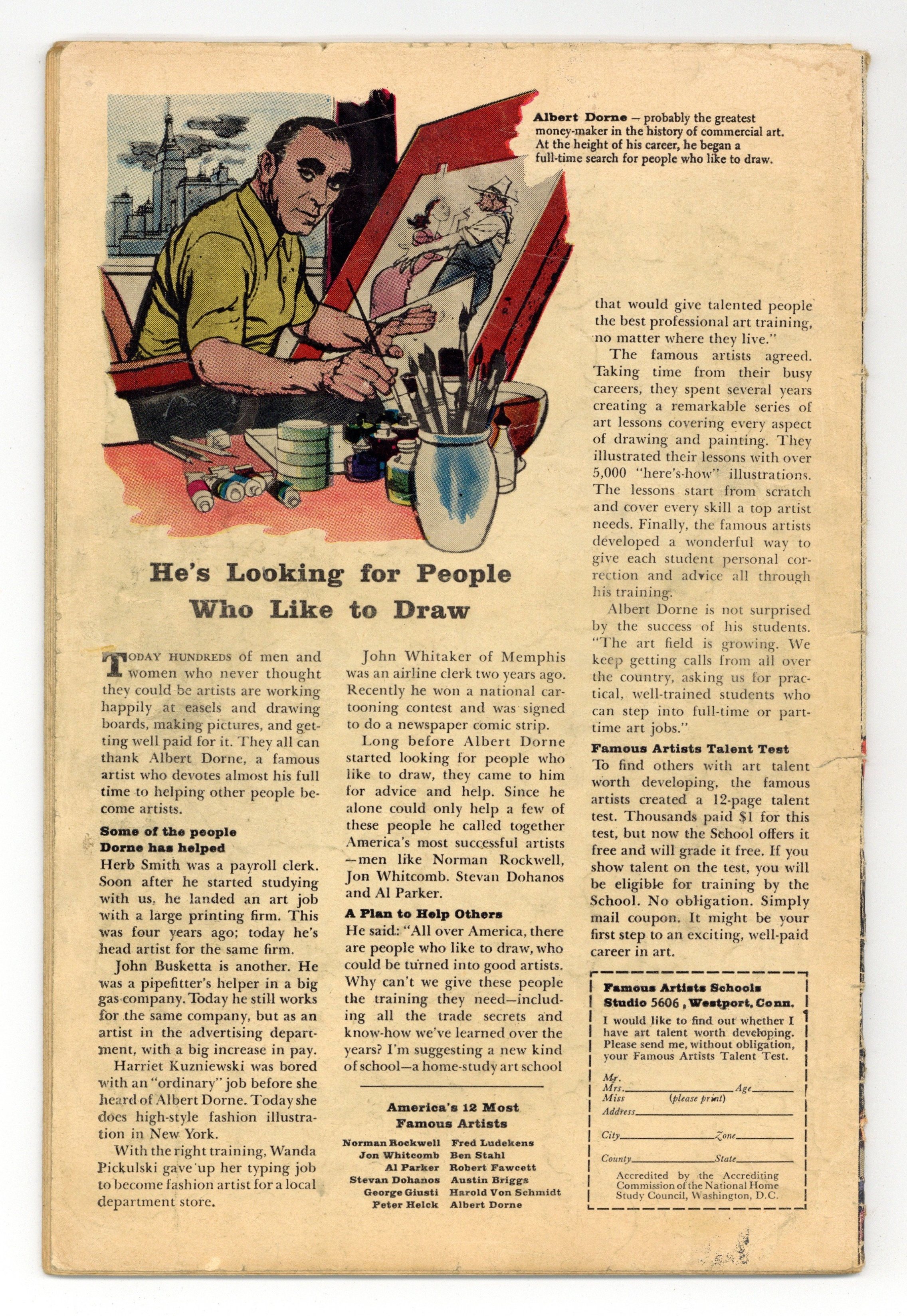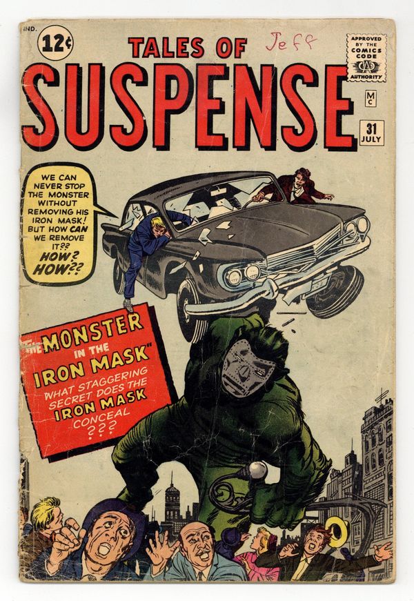 Cover pencils by Jack Kirby, inks by Dick Ayers. "The Monster in the Iron Mask!", pencils by Jack Kirby, inks by Dick Ayers; A seemingly invincible alien attacks Earth, but a magician realizes that he is using misdirection to keep from facing his one weakness: gas. "Time Machine" text story. "The Man Who Found Shangri-La!", pencils by Jack Kirby, inks by Dick Ayers; A thief uses his brother to find Shangri-La; He sees a ruin full of savages and flees into the mountains to die, while his brother finds paradise, since in Shangri-La everyone gets what they deserve. "The Crackpot," art by Don Heck; An unsuccessful inventor finally gives up, throwing his final invention away; A boy accidentally uses the gun to disintegrate three communist agents without even noticing. "The Missing Link!", script by Stan Lee, art by Steve Ditko; Scientists find a seemingly primitive man, but they discover that he is really from a future where nuclear war has destroyed civilization. 36 pages, full color. Cover price $0.12.