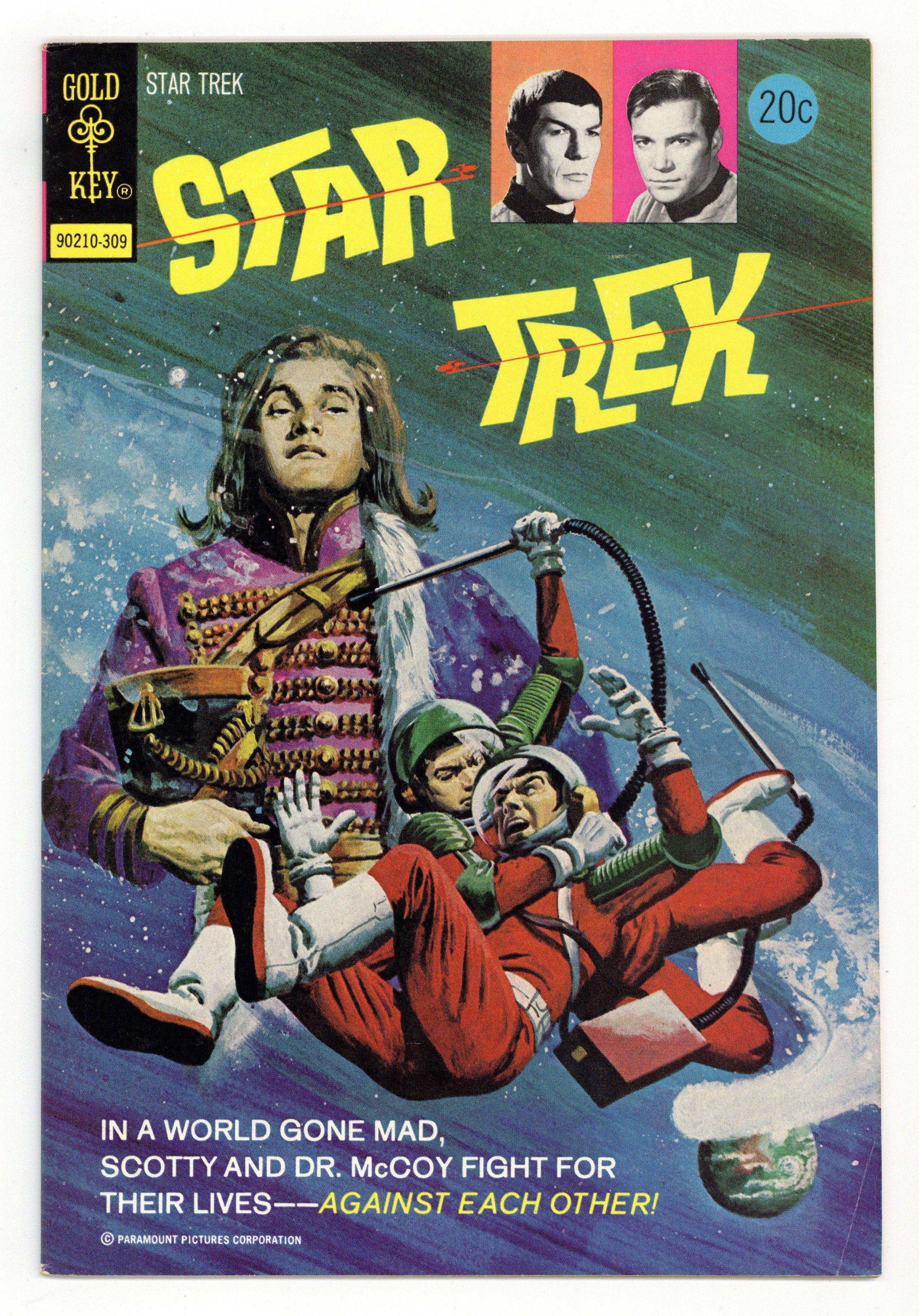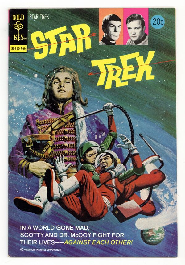 Comic book version of the original Star Trek TV series that starred William Shatner and Leonard Nimoy. 90210-309. Painted cover by George Wilson, with inset photos of William Shatner as Kirk and Leonard Nimoy as Spock. "A World Gone Mad," script by Arnold Drake, art by Alberto Giolitti; The crew of the Enterprise must bring calm to a planet gone mad...if they don't go crazy themselves! 36 pgs., full color. $0.20. Cover price $0.20.