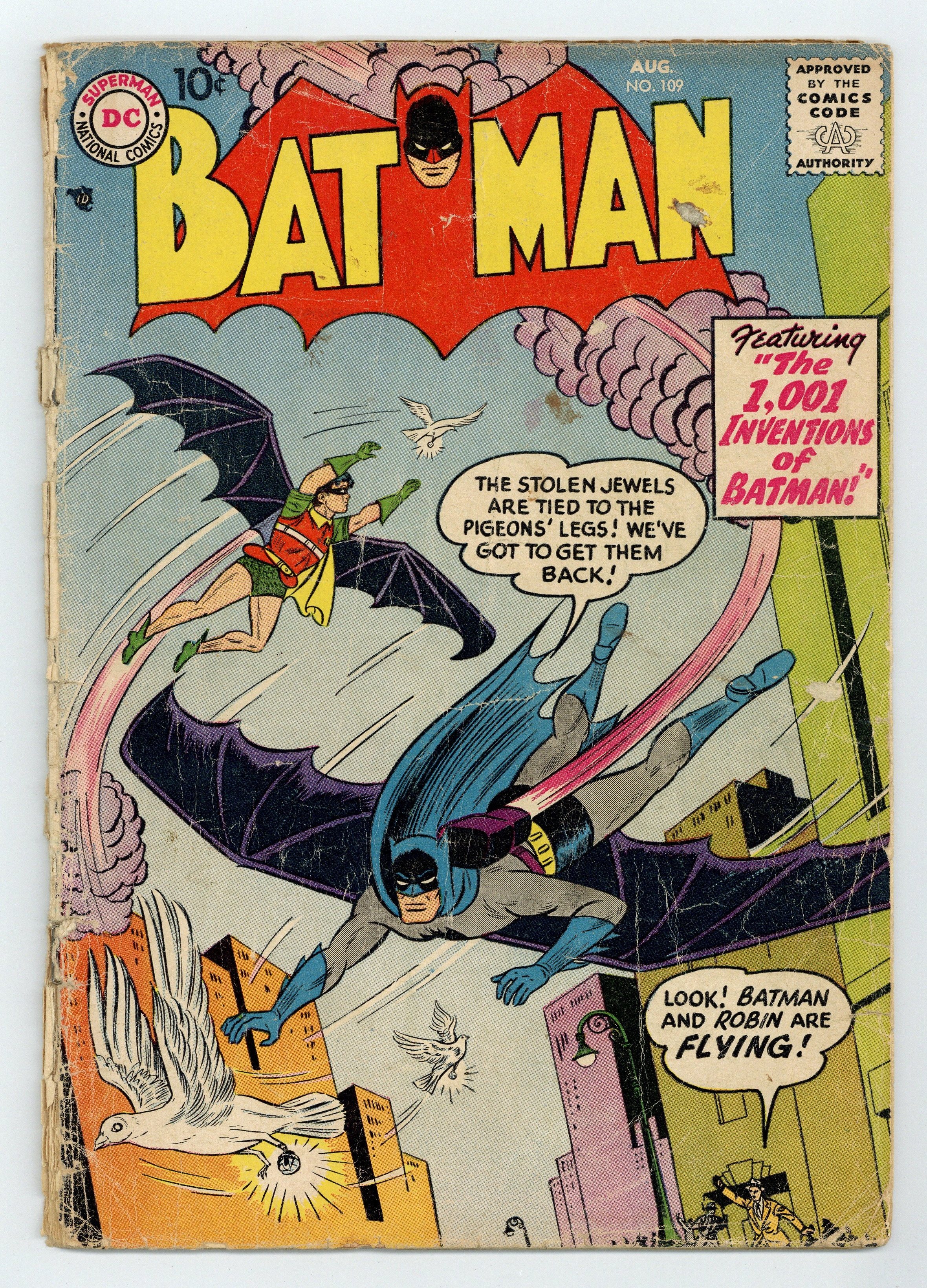 Cover pencils by Sheldon Moldoff, inks by Charles Paris. "Three Crimes Against Batman," pencils by Sheldon Moldoff, inks by Charles Paris; Batman turns the table on a crook who has successfully stolen several of the Caped Crusader's prized trophies. Earn While You Learn? public service announcement, art by Ruben Moreira. One-page Casey the Cop story by Henry Boltinoff. "Follow the Batman," pencils by Sheldon Moldoff, inks by Charles Paris; A crook named Waller sees the Batmobile run off the road, knocking out the Caped Crusader and injuring Robin, and he decides to use the occasion to replace the Batman for his own purposes. One-page Warden Willis story by Henry Boltinoff. Half-page Shorty story by Henry Boltinoff. "Beware: Detective at Work" text story. "The 1,001 Inventions of Batman," script by Edmond Hamilton, pencils by Dick Sprang, inks by Charles Paris; Unbeknownst to Batman and Robin, a criminal scientist succeeds in X-raying and then building his version of the Batman's effective crime tool, the Flying Eye, to use against the Dynamic Duo. 36 Pages, Full Color. Cover price $0.10.