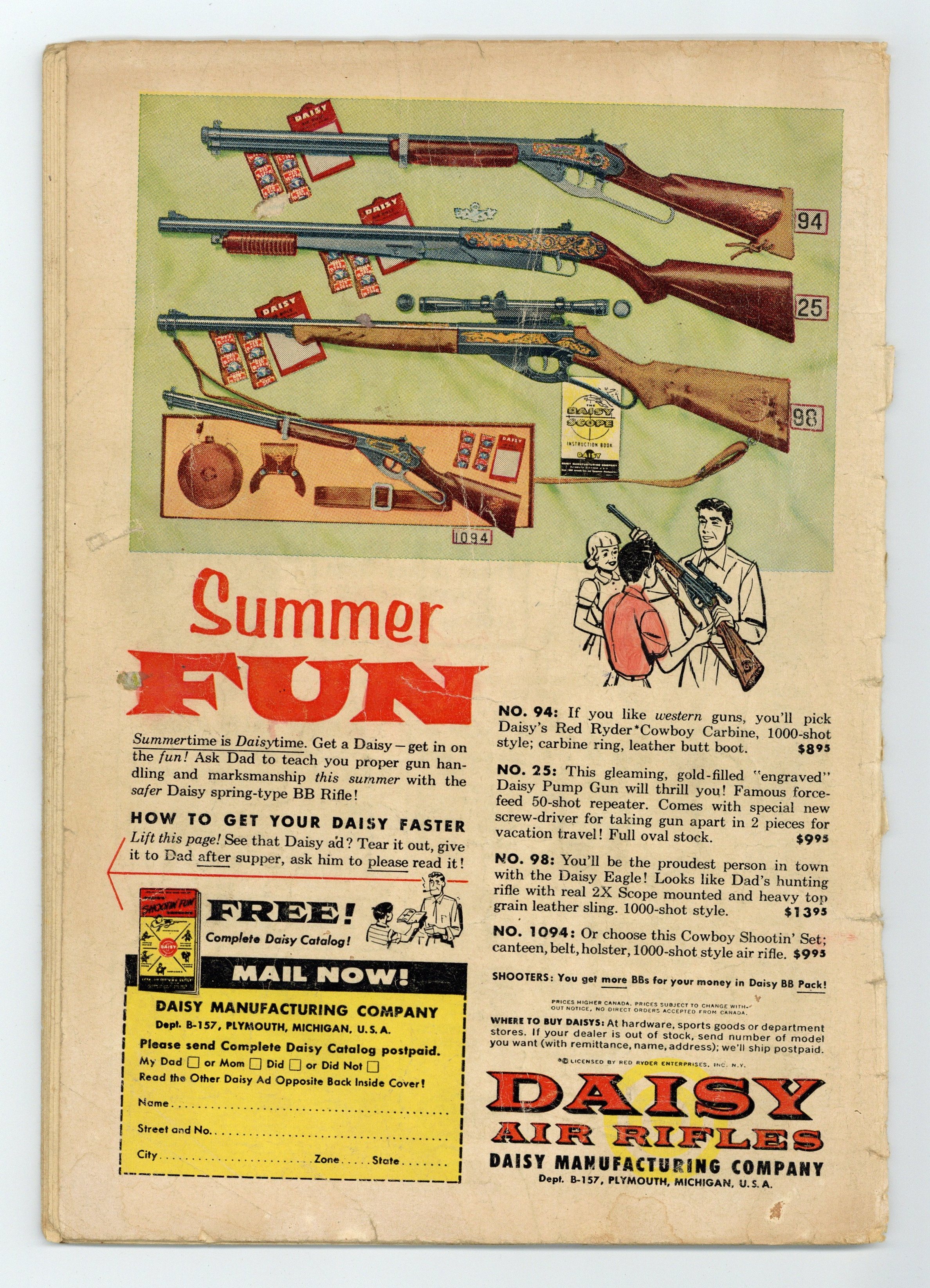 Tags: Batman$135.00Cover pencils by Sheldon Moldoff, inks by Charles Paris. "Three Crimes Against Batman," pencils by Sheldon Moldoff, inks by Charles Paris; Batman turns the table on a crook who has successfully stolen several of the Caped Crusader's prized trophies. Earn While You Learn? public service announcement, art by Ruben Moreira. One-page Casey the Cop story by Henry Boltinoff. "Follow the Batman," pencils by Sheldon Moldoff, inks by Charles Paris; A crook named Waller sees the Batmobile run off the road, knocking out the Caped Crusader and injuring Robin, and he decides to use the occasion to replace the Batman for his own purposes. One-page Warden Willis story by Henry Boltinoff. Half-page Shorty story by Henry Boltinoff. "Beware: Detective at Work" text story. "The 1,001 Inventions of Batman," script by Edmond Hamilton, pencils by Dick Sprang, inks by Charles Paris; Unbeknownst to Batman and Robin, a criminal scientist succeeds in X-raying and then building his version of the Batman's effective crime tool, the Flying Eye, to use against the Dynamic Duo. 36 Pages, Full Color. Cover price $0.10.