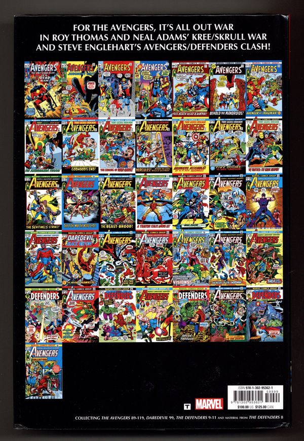2nd Edition - Volume 4 - 1st printing. Collects The Avengers (1963-1996 1st Series) #89-119, Daredevil (1964-1998 1st Series) #99, and The Defenders (1972-1986 1st Series) #8-11. Written by Roy Thomas, Neal Adams, Chris Claremont, Steve Englehart, and Steve Gerber. Art by John Buscema, Sal Buscema, Neal Adams, Barry Windsor-Smith, Jim Starlin, Bob Brown, Sam Kweskin, Tom Palmer, Sam Grainger, George Roussos, Tom Sutton, Joe Sinnott, Syd Shores, Rich Buckler, Dan Adkins, Jim Mooney, George Tuska, Dave Cockrum, Don Heck, Frank McLaughlin, Mike Esposito, Frank Giacoia, Frank Rolle, and Bob Brown. Cover by Arthur Adams. Caught in the crossfire, Earth has become the staging ground for a conflict of cosmic proportions! The merciless Kree and the shape-changing Skrulls have gone to war and humanity is on the front line. It's Roy Thomas and Neal Adams' classic Kree-Skrull War! Then, every Avenger from day one returns - to battle Ares and the Enchantress! And there's no time wasted upping the ante when the mutant-hunting Sentinels return from the heart of the sun. Next, enter: Steve Englehart! The Avengers' new writer doesn't miss a beat as he builds up to Marvel's first hero-vs.-hero epic - the Avengers-Defenders War! Also featuring Mantis' first appearance, Vision and the Scarlet Witch's growing romance and a battle with Magneto alongside the X-Men! Hardcover, 856 pages, full color. Rated T Cover price $100.00.