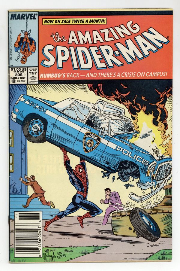 Tags: Spider-Man$35.00Newsstand Edition. "Humbugged!" Script by David Michelinie. Art by Todd McFarlane. Cover by Todd McFarlane. The pesky Humbug is back! And the insect-infatuated villain wants to resume his research on the ESU campus! But the crazy entomologist runs into his most-reviled insect first: the Spectacular Spider-Man! Let the extermination begin! Meanwhile at Bedford Towers, Peter and Mary Jane's neighbor, Jonathon Caesar, is acting stranger and stranger...perhaps even a bit obsessive! Cameo appearances by the Chameleon, Aunt May, and the Black Cat. (Notes: The Humbug previously appeared in Web of Spider-Man 19. McFarlane's cover is a tribute to the 50th anniversary of Superman and the cover of Action Comics #1.) 36 pgs. Cover price $1.00.